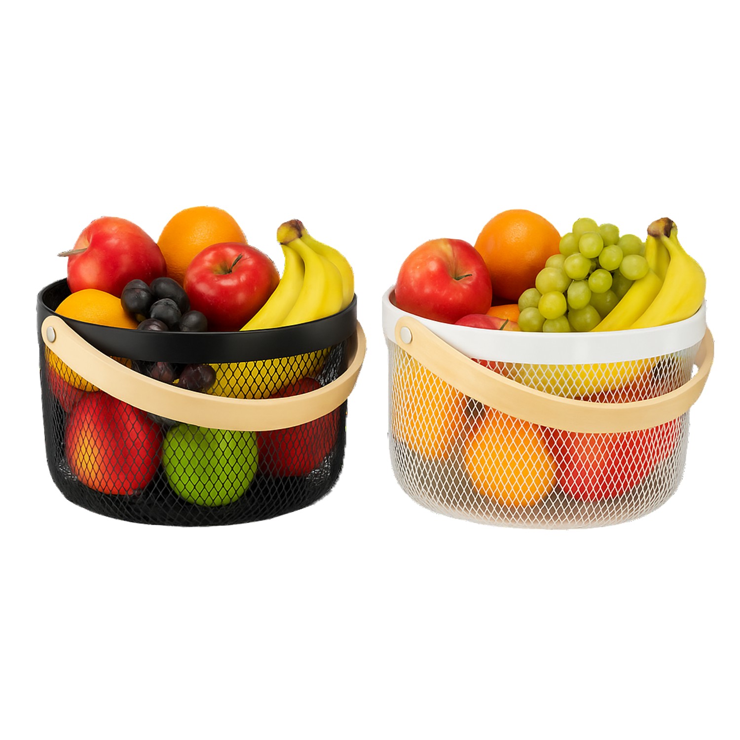 Круглая корзина для фруктов с ручкой.Материал: стальной каркас, деревянная ручкаРазмер: 25 x 25 x 17,5 смДоступны два цвета на выбор: белый и черный.