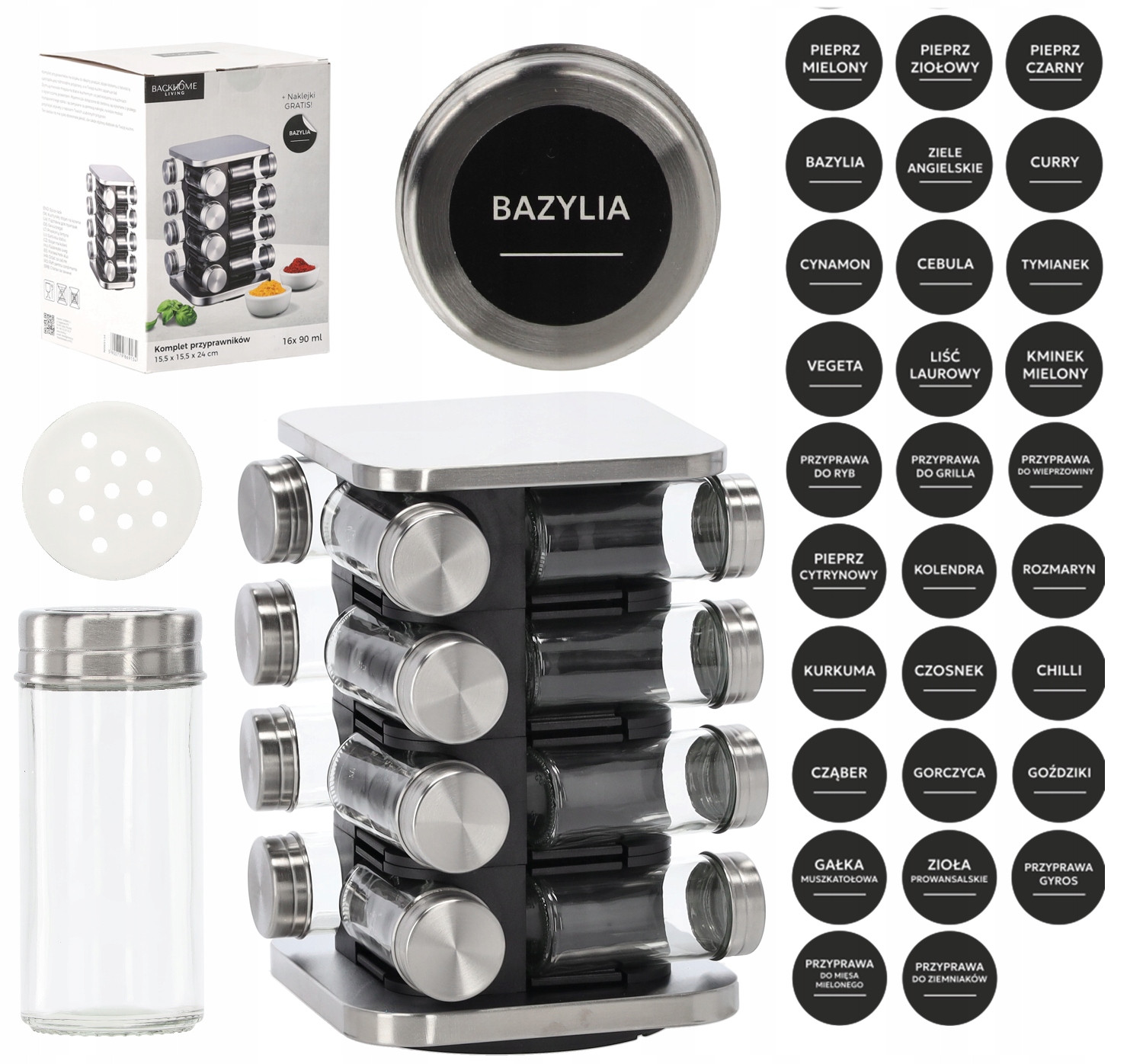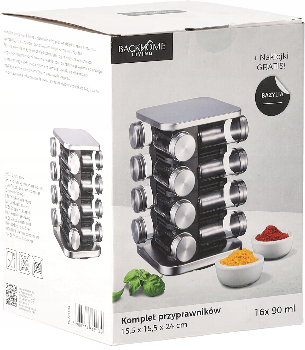 16 прозрачных банок с пластиковыми крышками, которые облегчают идентификацию содержимого. Каждая банкаобъемом 90 мл идеально подходит для различных специй.