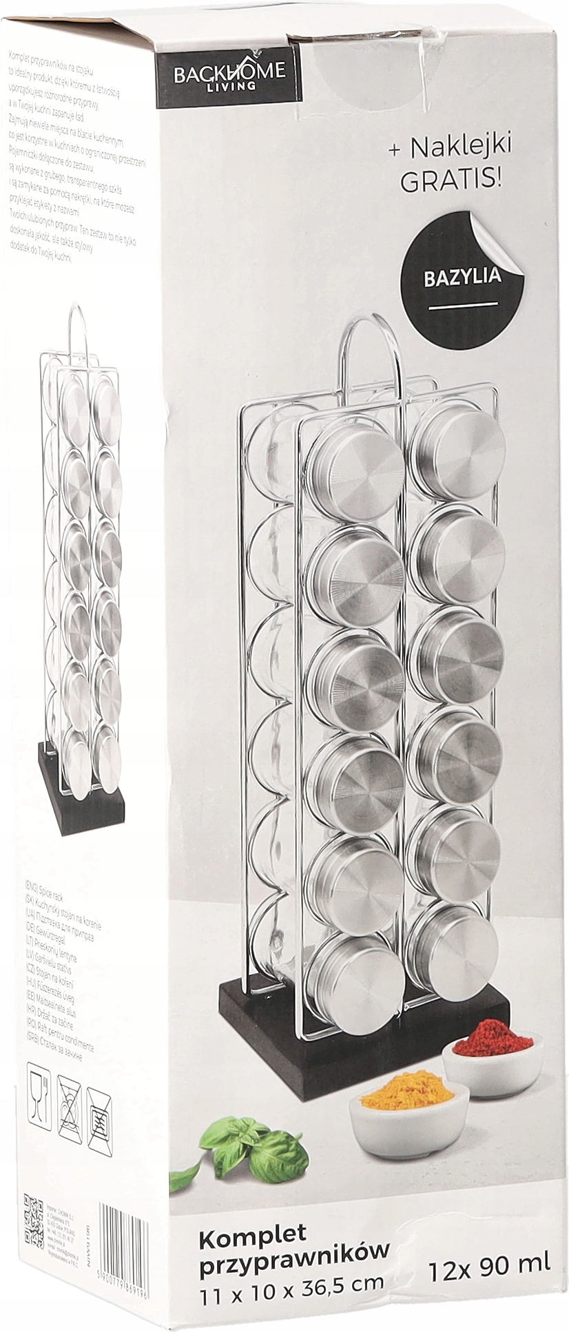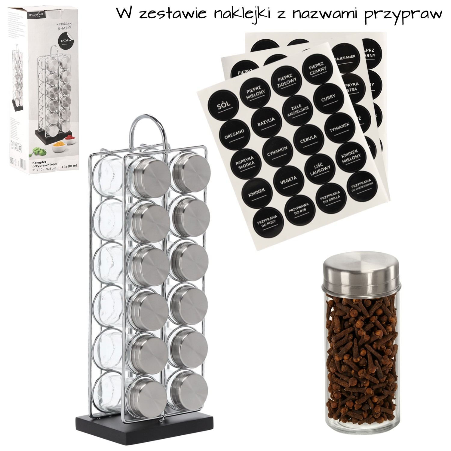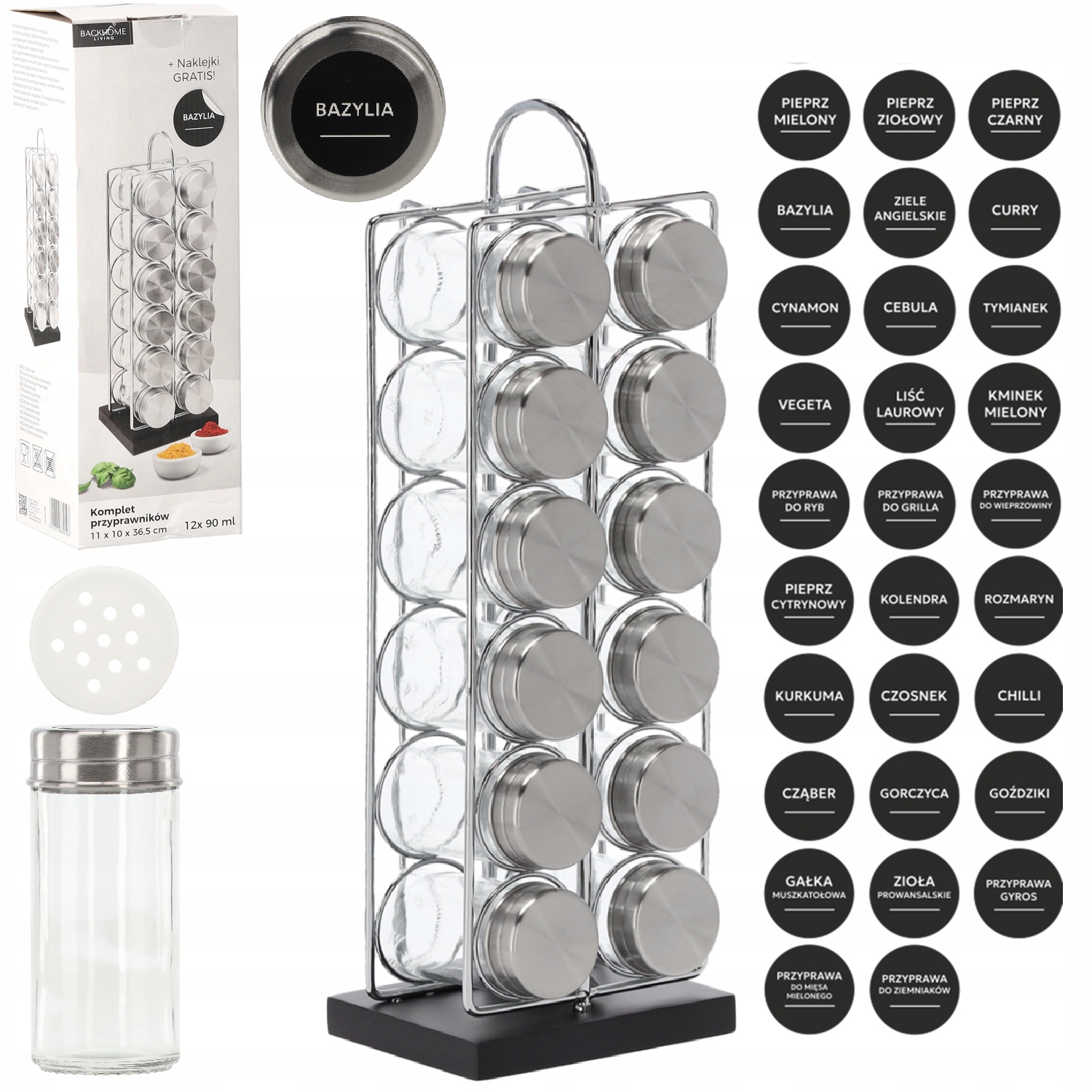 12 прозрачных баночек со стальными крышками, которые облегчают идентификацию содержимого. Каждая баночкаобъемом 90 мл идеально подходит для различных специй.