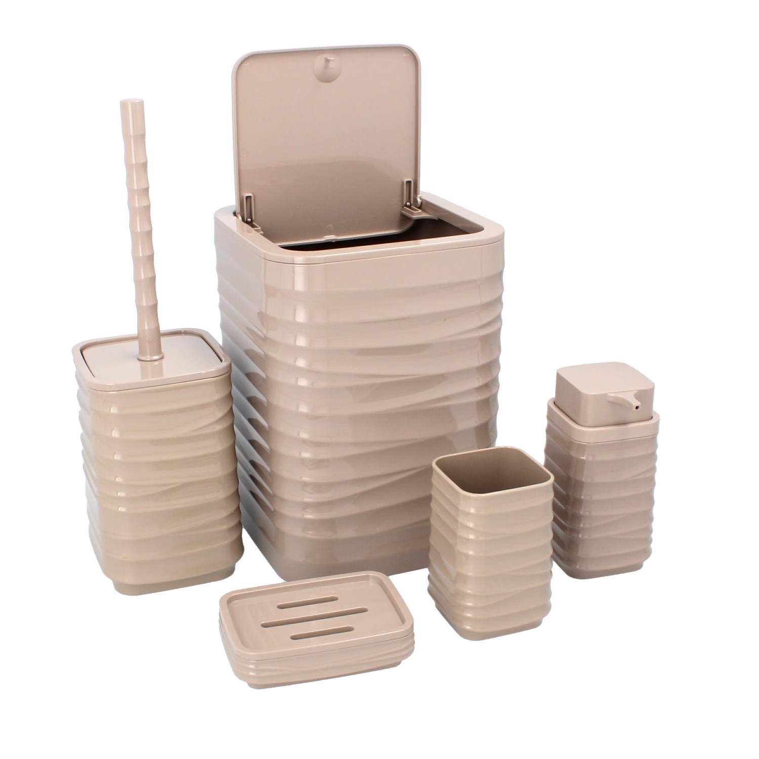 Набор для ванной комнаты, 5 предметов, квадратный, коричневого цвета, изготовлен из пластика.В комплект входят:-корзина для мусора 18x25 см-туалетная щетка: 10,5x34,5 см-дозатор мыла 7x14,5 см-стакан для зубной щетки 7x11 см-мыльница 12x8,5x3,4 см