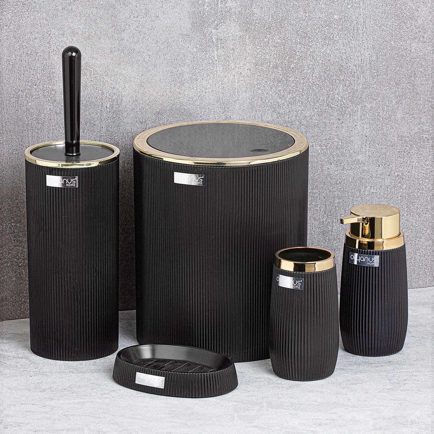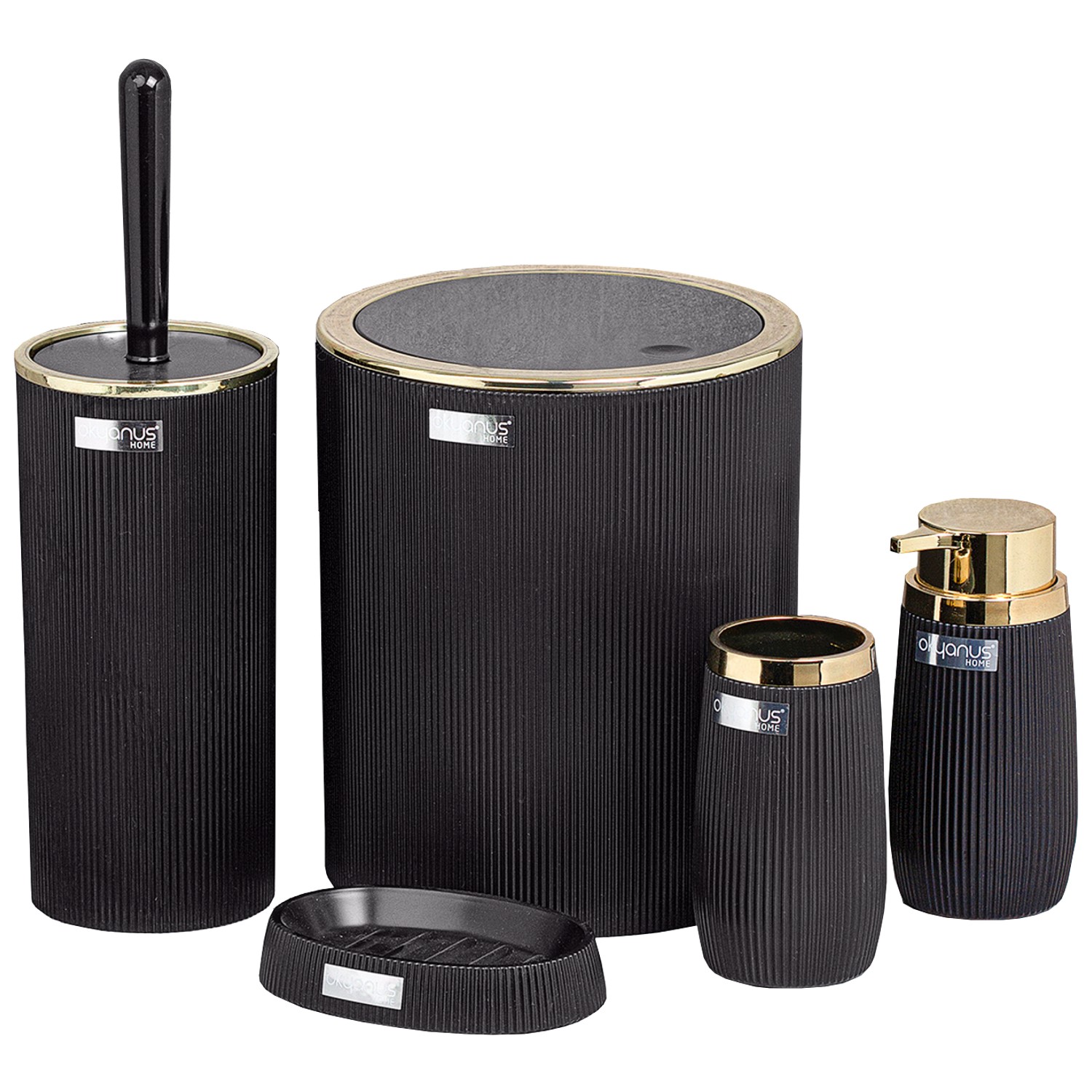 Набор для ванной комнаты из 5 элементов , круглый, черного цвета с золотыми отделками, изготовлен из пластика.В комплект входят:-корзина для мусора 19x22,3 см-туалетная щетка: 10,2x34,2 см-дозатор мыла 8x15,8 см-стакан для щетки 7,3x13 см-мыльница 12,6x9x2,7 см