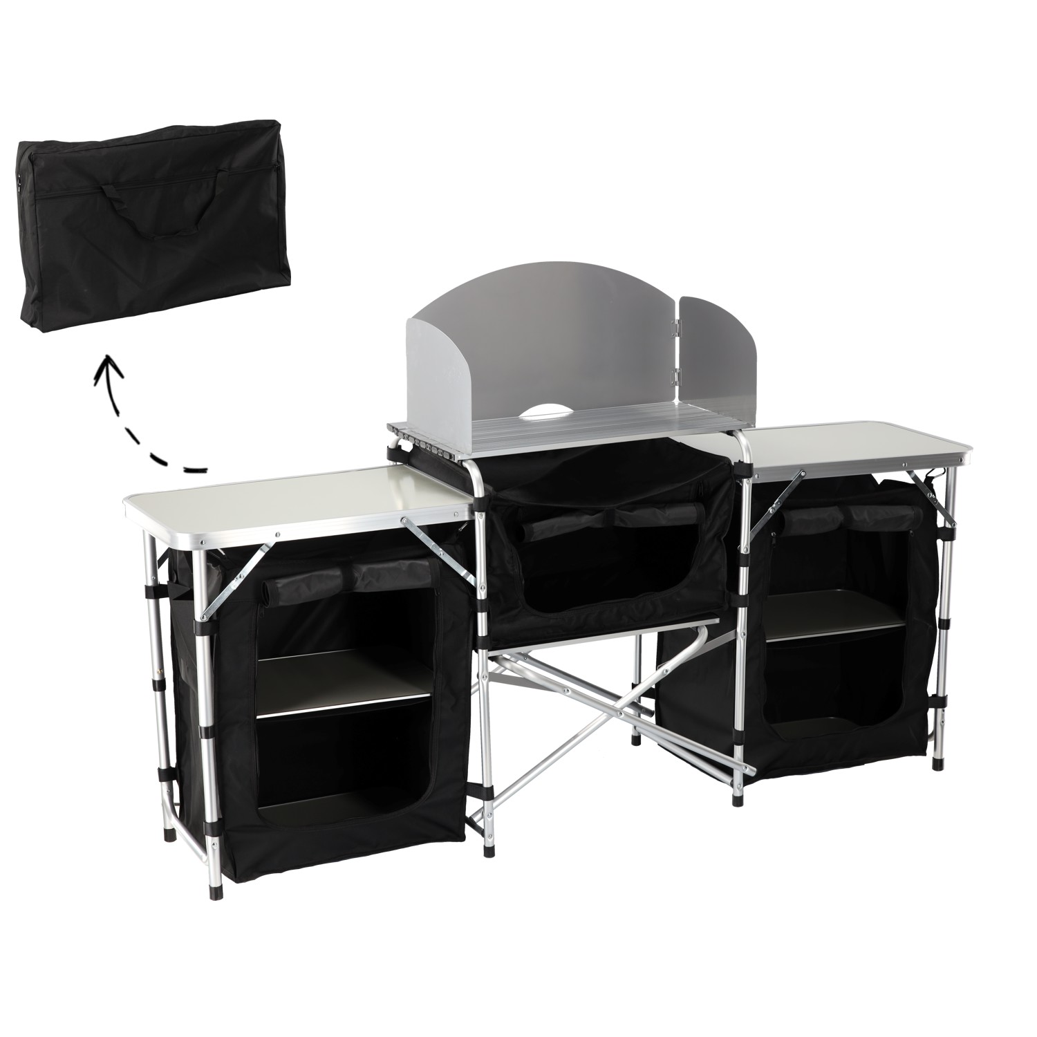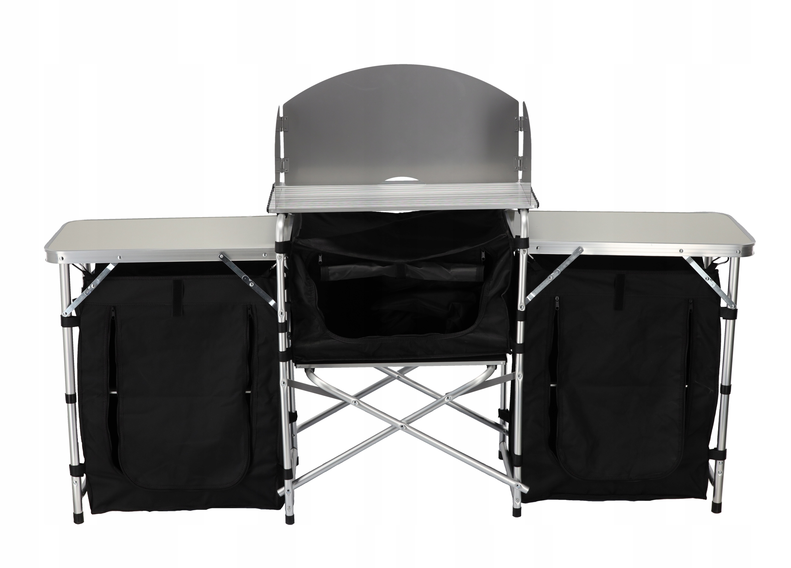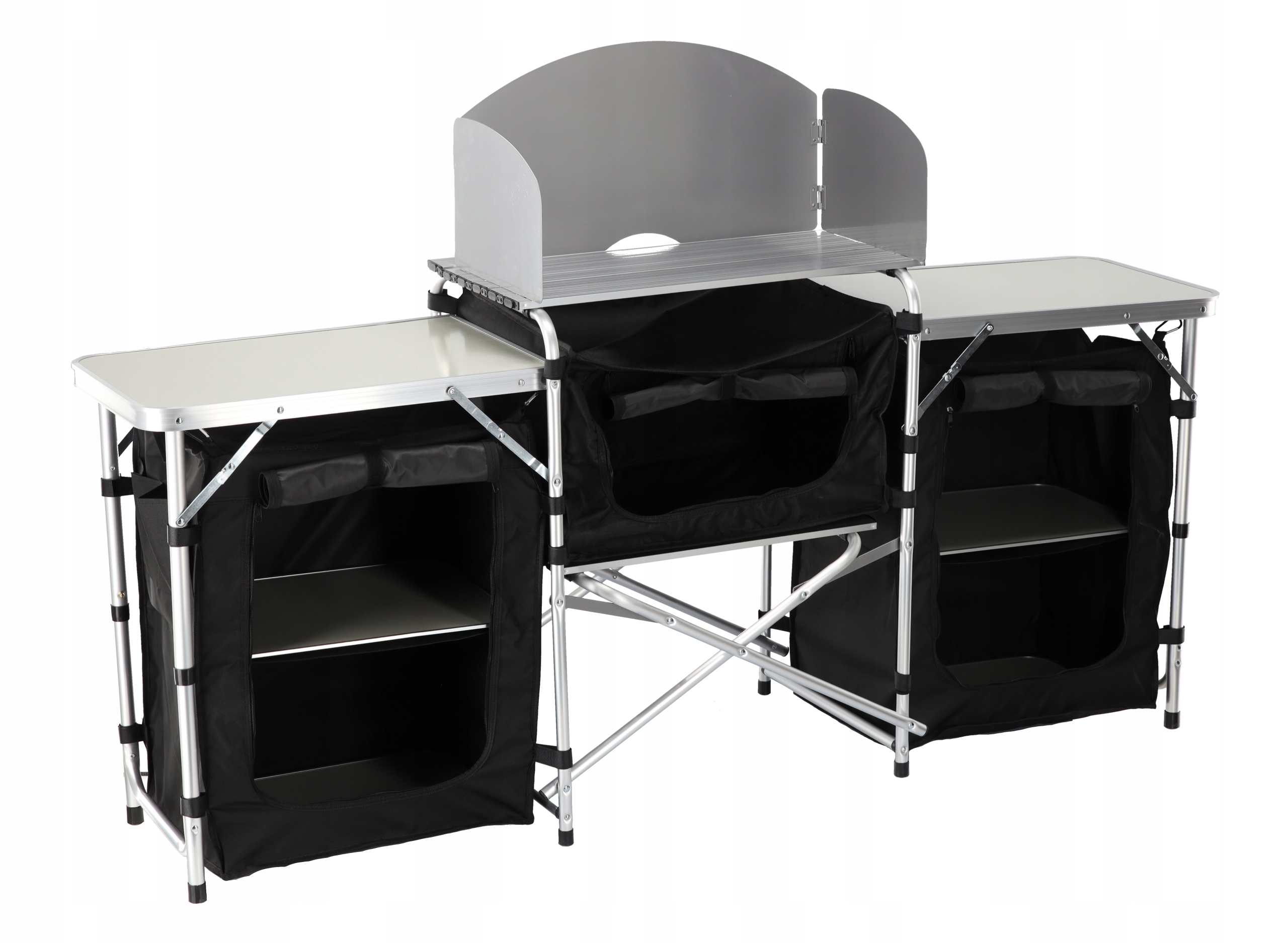 Складная кемпинговая кухня компактных размеров в сложенном состоянии, что облегчает хранение и транспортировку. Прочная конструкция из МДФ и алюминия обеспечивает стабильность и прочность при использовании в кемпинге.
