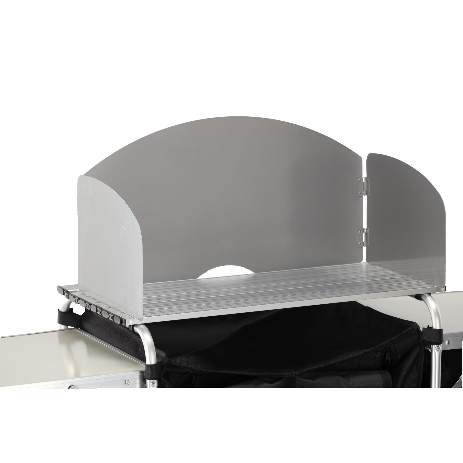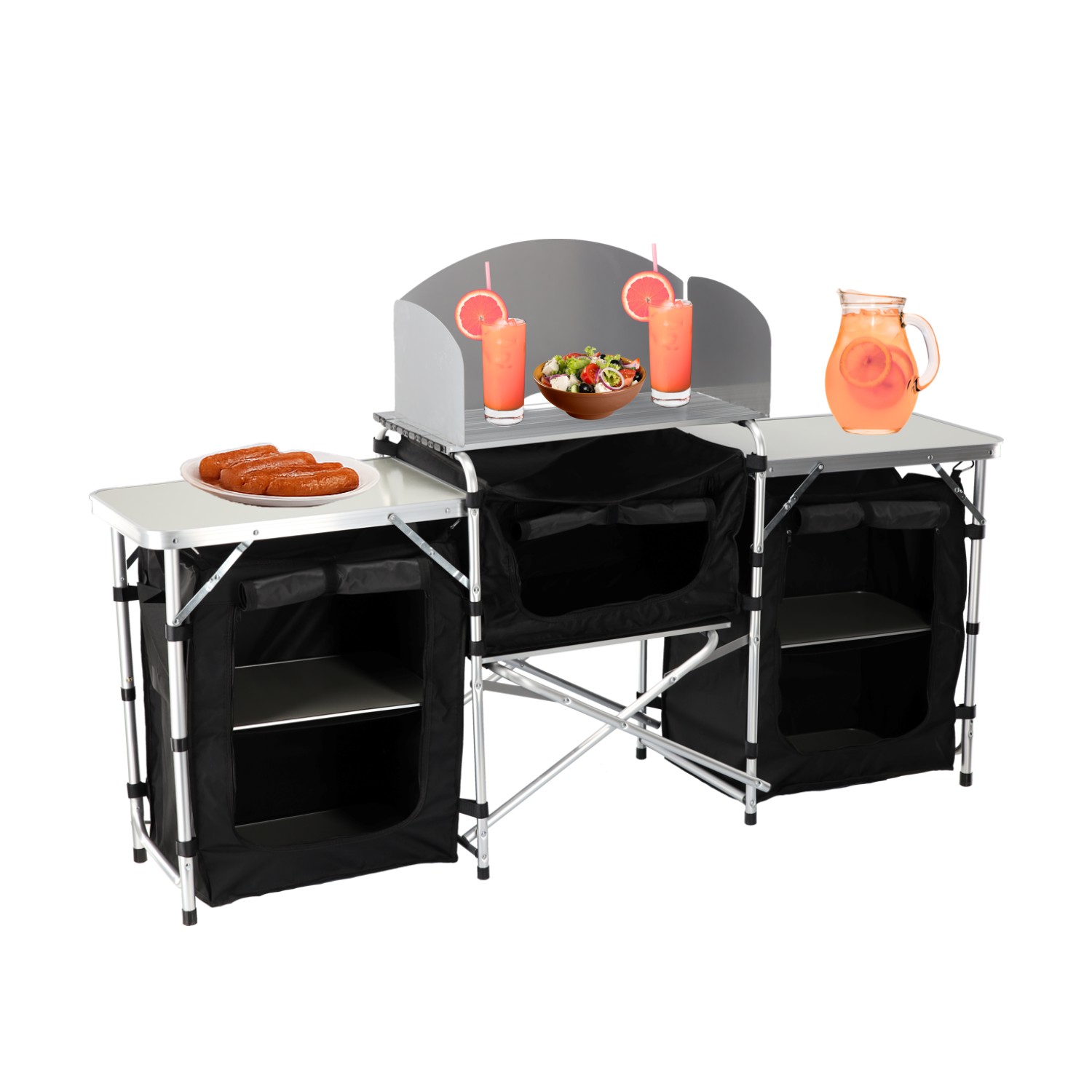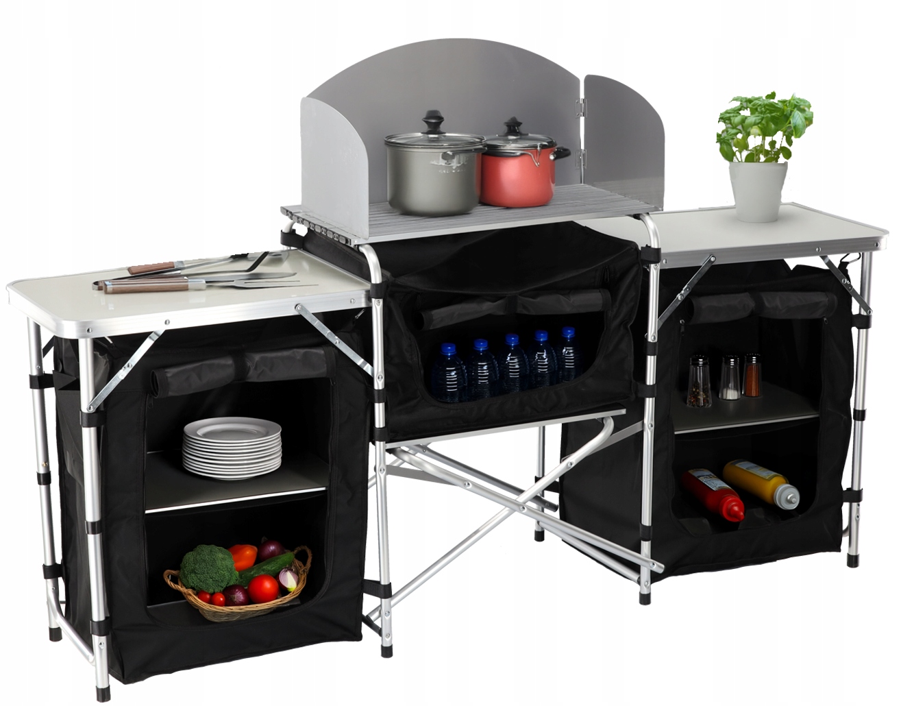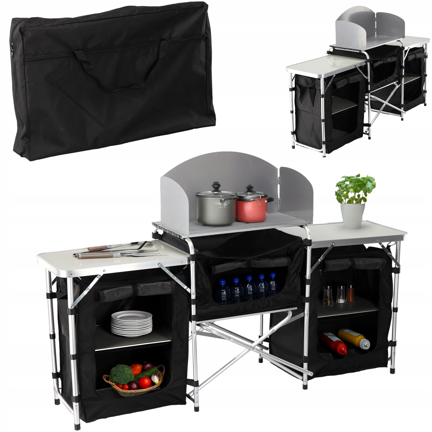 Складная кемпинговая кухня компактных размеров в сложенном состоянии, что облегчает хранение и транспортировку. Прочная конструкция из МДФ и алюминия обеспечивает стабильность и прочность при использовании в кемпинге.