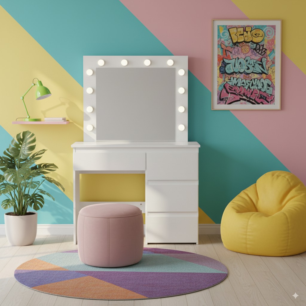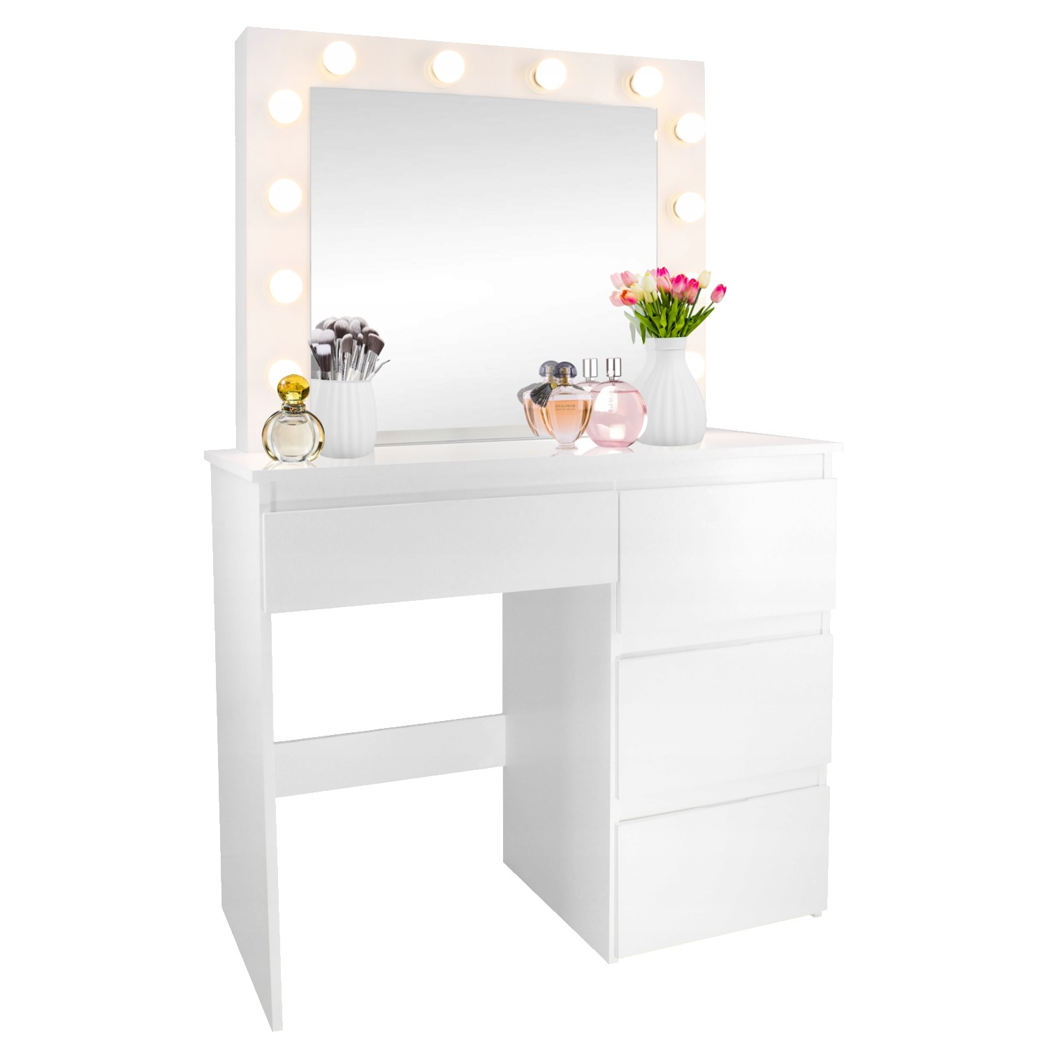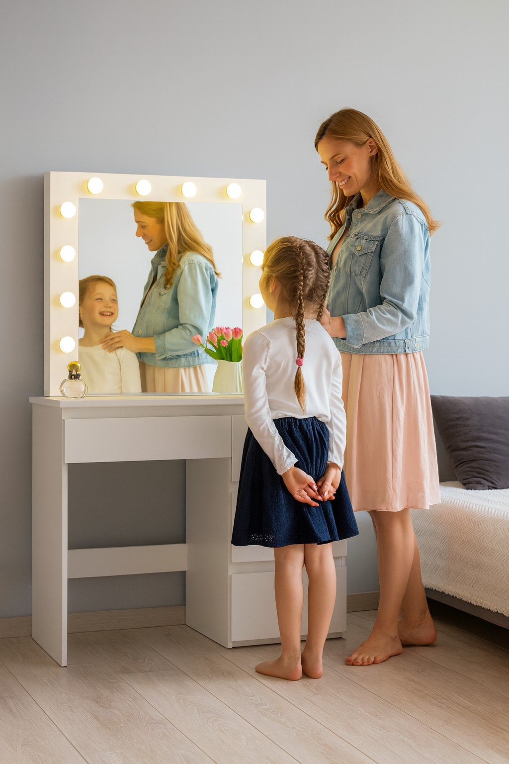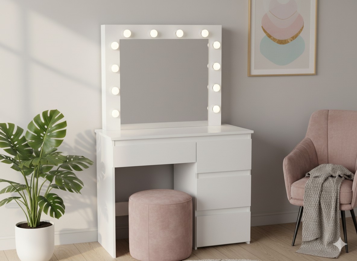 Вы мечтаете о месте, где вы будете чувствовать себя как кинозвезда? 🌟 Косметический столик – это сочетание элегантности, функциональности и уникального стиля. 💡 Большое зеркало с 12 светодиодными лампами обеспечивает идеальное освещение для нанесения макияжа. 🗄️ Четыре вместительных ящика поместят все ваши косметические средства и украшения. Этот предмет мебели не только украсит интерьер, но и сделает ежедневный уход за собой настоящим удовольствием. 💖