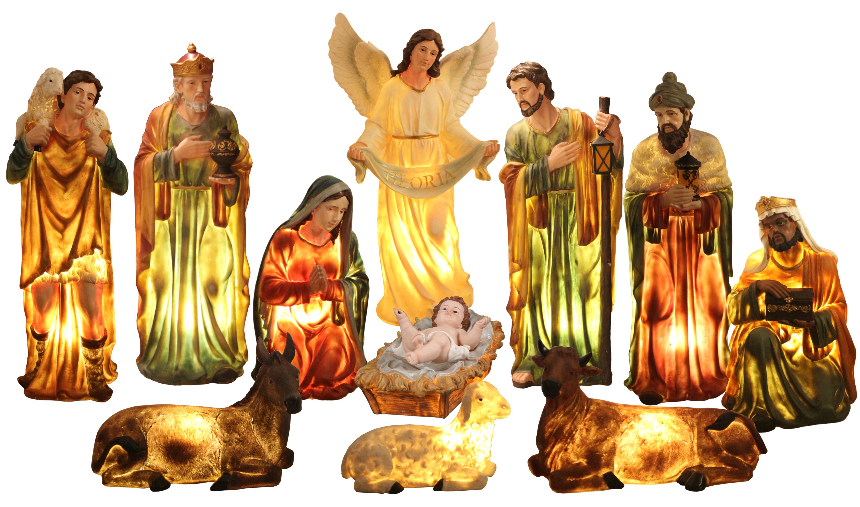 Создайте уникальную и торжественную атмосферу Рождества благодаря набору из 11 фигурок с подсветкой, изготовленных из высококачественной эпоксидной смолы. В комплект входят все основные персонажи рождественской сцены: Младенец Иисус, Мария, Иосиф, Ангел, Три Царя, Пастух и животные. Это классический набор, который позволит создать красивый и гармоничный рождественский вертеп.
