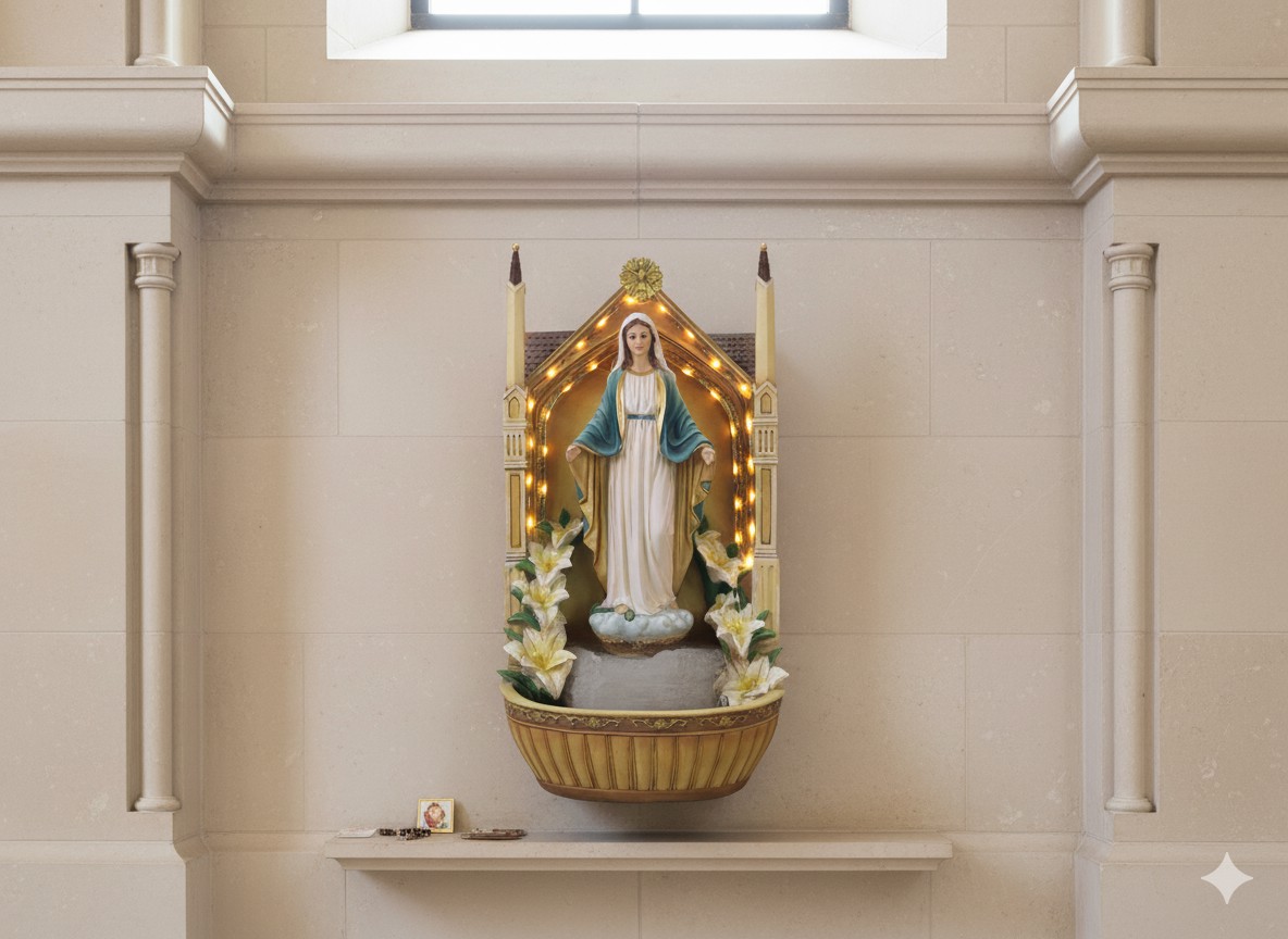 Красивый декоративный фонтан с фигурой Святой Марии, расположенной в декоративной часовне с LED-подсветкой. Это уникальный элемент, который привнесет в интерьер спокойствие, гармонию и духовное тепло. Идеально подходит для дома, часовни, зимнего сада или места молитвы.