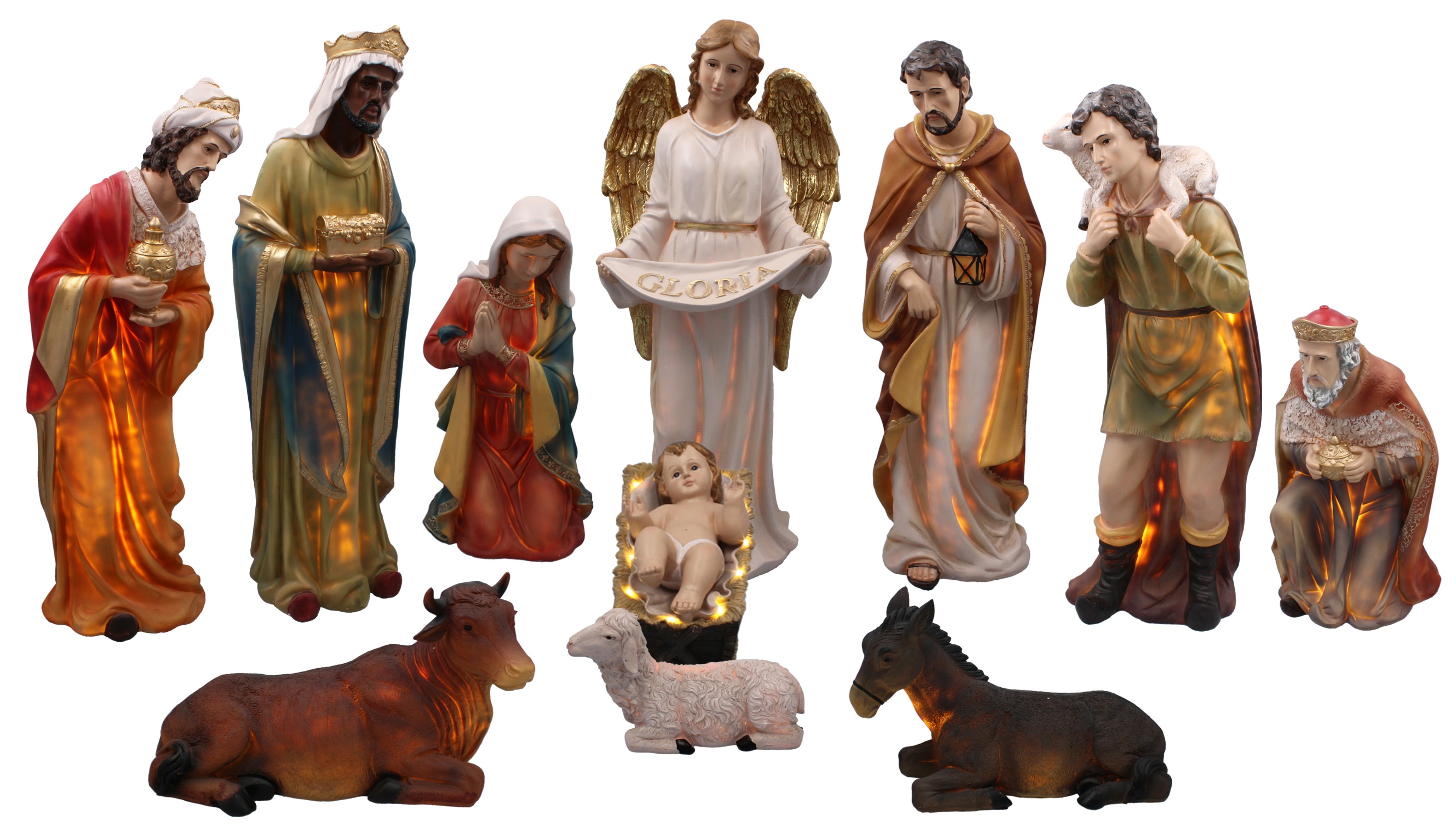 Набор из 11 подсвечиваемых фигурок для рождественского вертепа высотой до 70 см представляет собой элегантную и долговечную рождественскую декорацию. Ручная роспись деталей, прочная эпоксидная смола, устойчивая к погодным условиям и морозу до -20°C, а также светодиодная подсветка делают фигурки привлекательными как внешним видом, так и функциональностью. ❄️ и светодиодная подсветка 💡 делают фигурки привлекательными и функциональными.