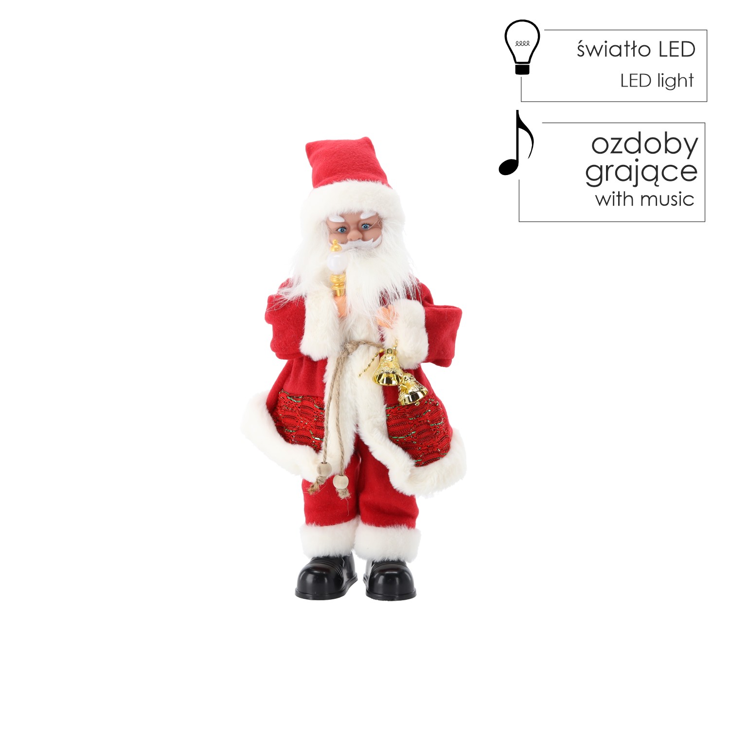 Этот играющий Санта с свечой представляет собой сочетание традиций и современности – классический персонаж в новом интерактивном исполнении. Он отлично подойдет в качестве подарка, украшения гостиной или элемента витрины магазина. Благодаря музыке и свету вы сможете создать волшебную атмосферу праздника за несколько секунд!