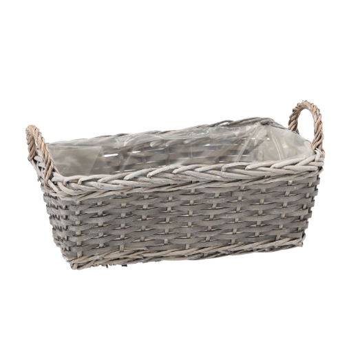 Плетеный прямоугольный чехолЭлегантный плетеный чехол в форме прямоугольной корзинки с ручками. Оснащен внутренней пленкой, которая предотвращает вытекание земли и воды. Идеально подходит для посадки растений, придает естественный акцент любому интерьеру или саду.Размеры кашпо: 38 x 19 x 14 см Размеры пространства для растений: 33 x 15 смЦвет: серый