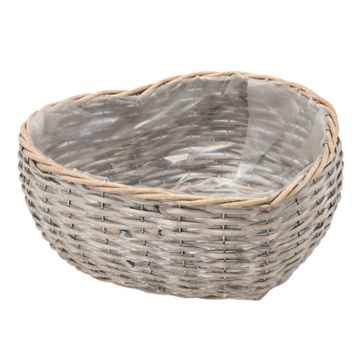 Плетеный чехол в форме сердцаОчаровательная плетеная корзина в форме сердца, идеально подходящая для украшения растений. Оснащена внутренней пленкой, которая предотвращает высыпание земли и утечку воды. Идеально подходит для создания романтических композиций в саду или в доме.Размеры кашпо: 32 x 34 x 13 см Размеры пространства для растений: 26 x 27 смЦвет: серый