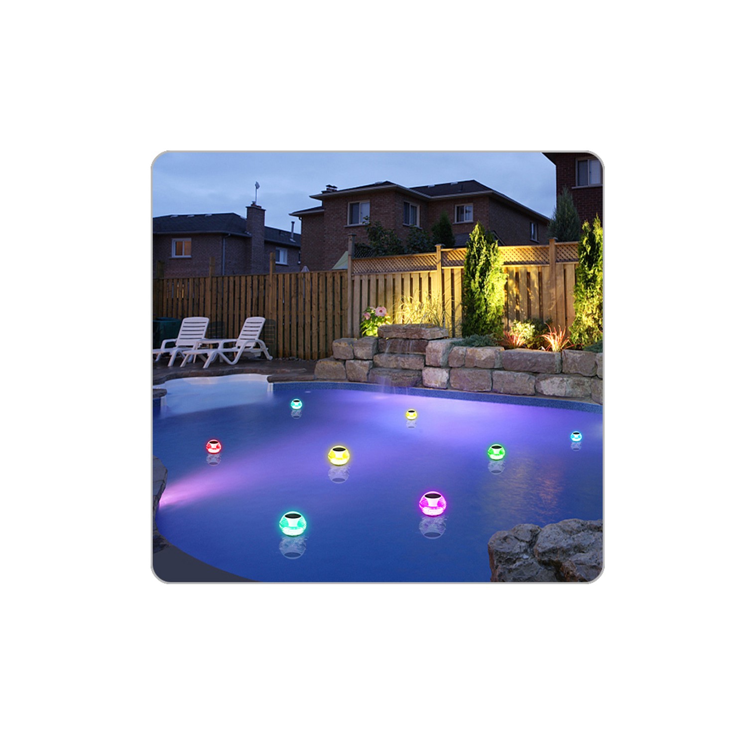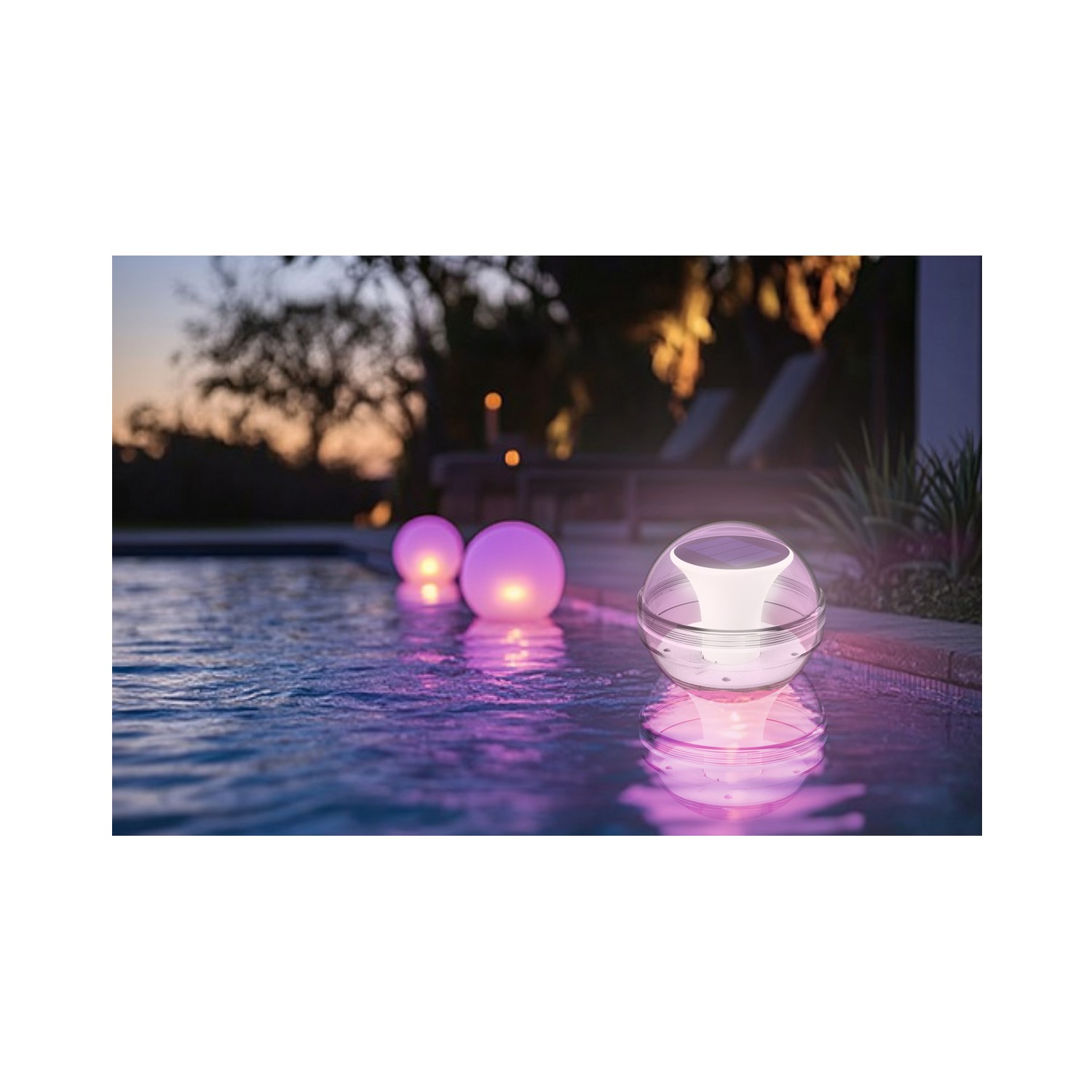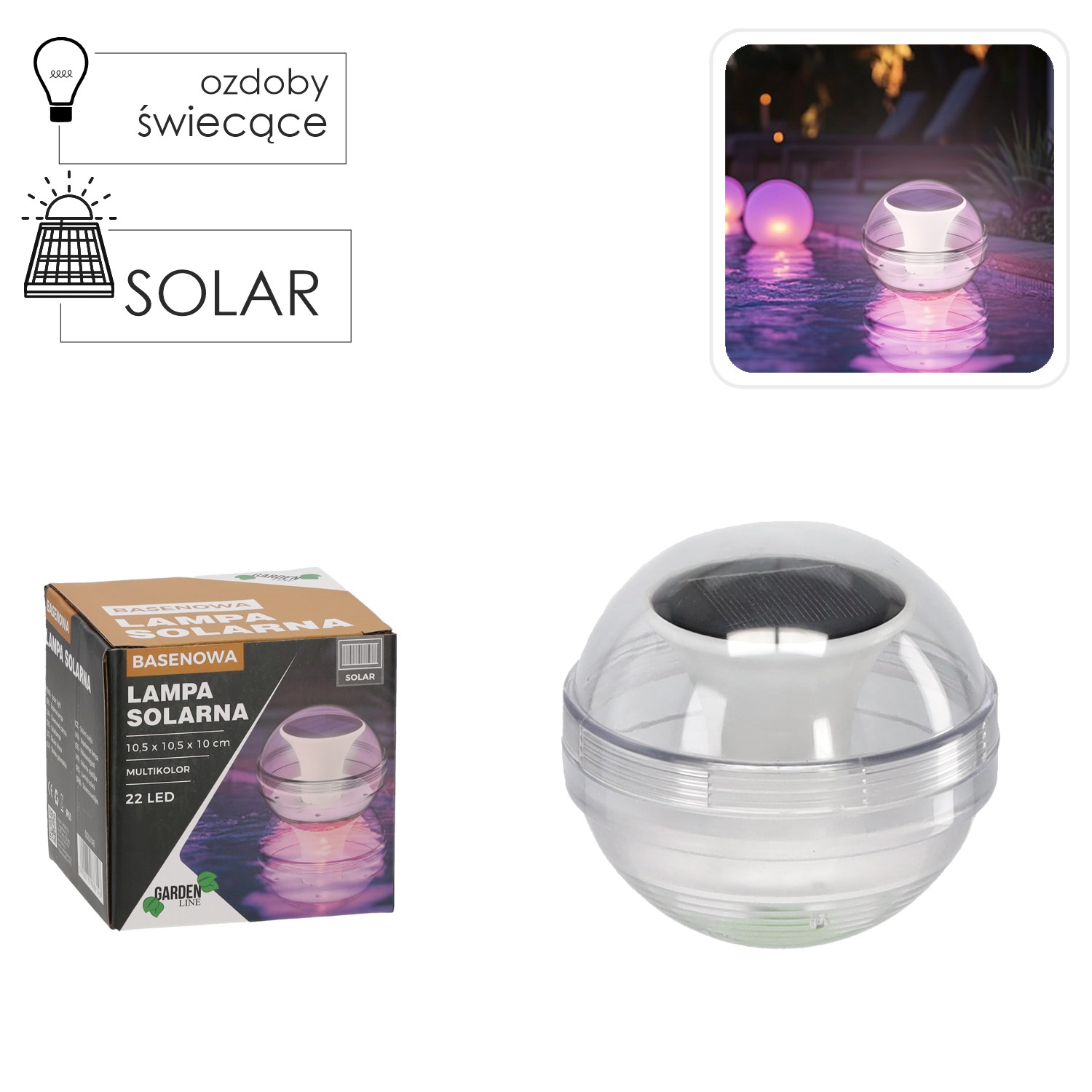 Плавающие солнечные лампы для бассейнаРазмеры продукта: 10,5 x 10,5 x 10 смОснащены 22 светодиодамиВозможность выбора между теплым белым, белым или меняющим цвет светомВ комплекте батарея 1,2 В AA 300 мАч NI-MHПоликристаллический солнечный панель, IP65Время зарядки: 7-8 часовВремя работы: 6-7 часов