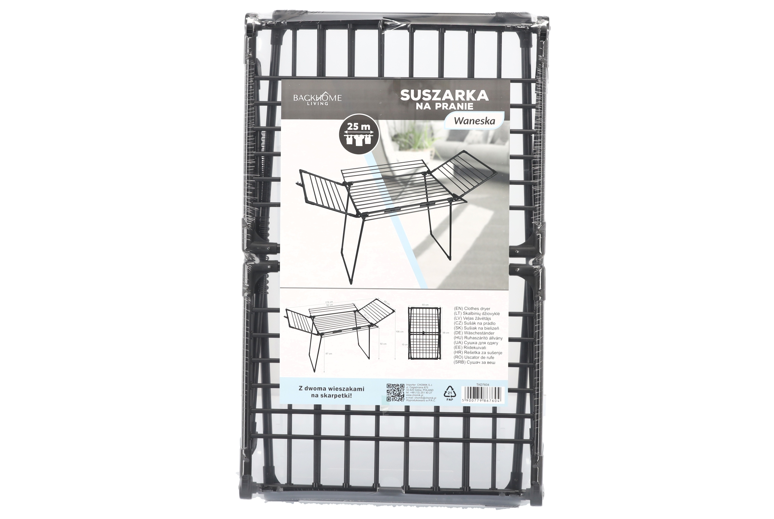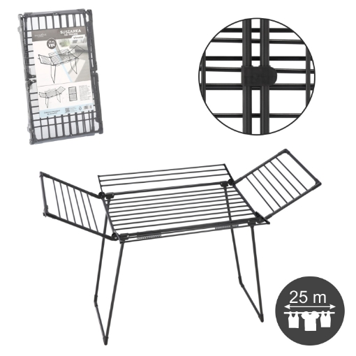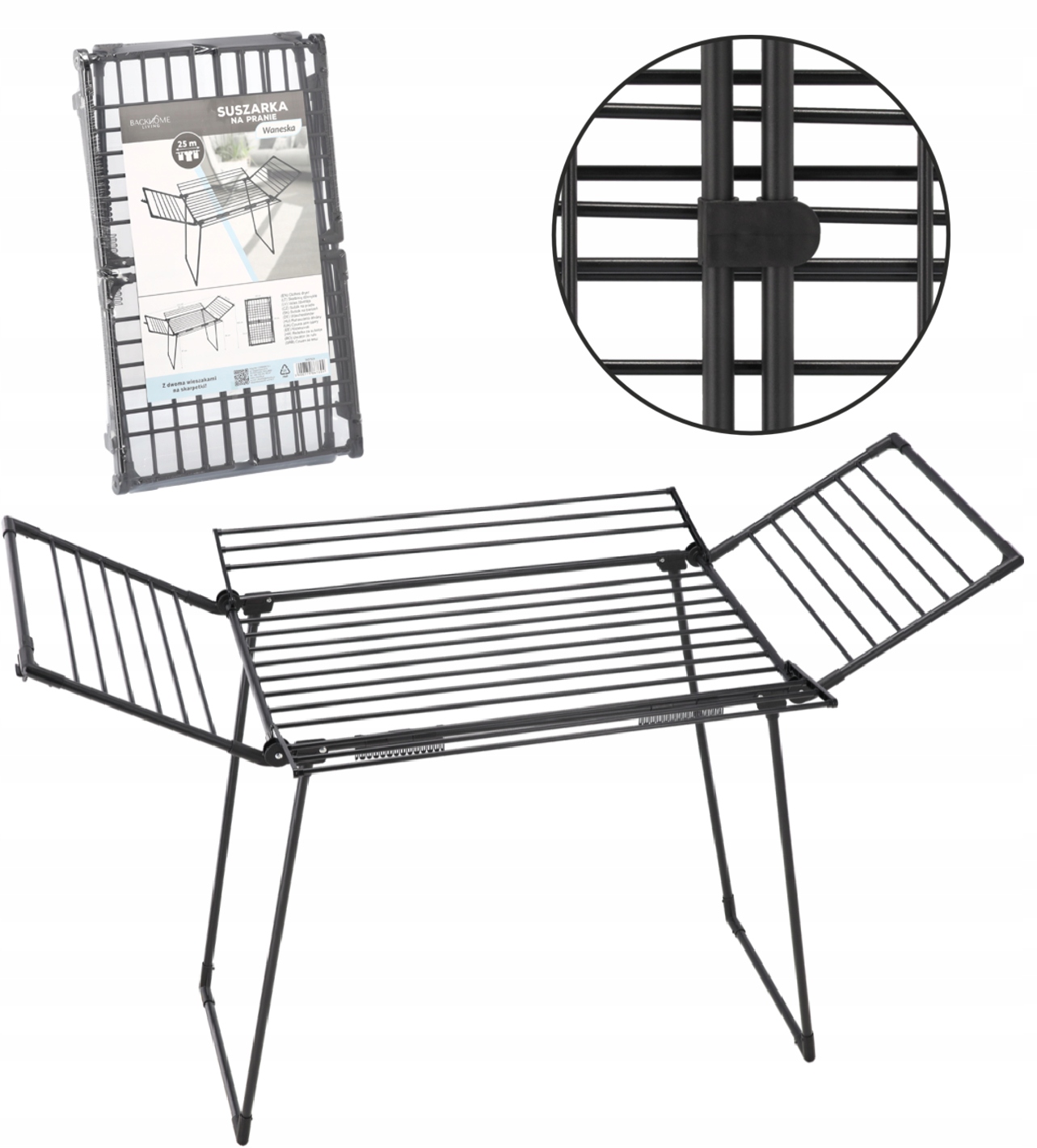 Материал: углеродистая сталь с порошковым покрытиемЦвет: матовый черныйСушилка с четырьмя крючками2 держателя для носков Регулируемая ширина