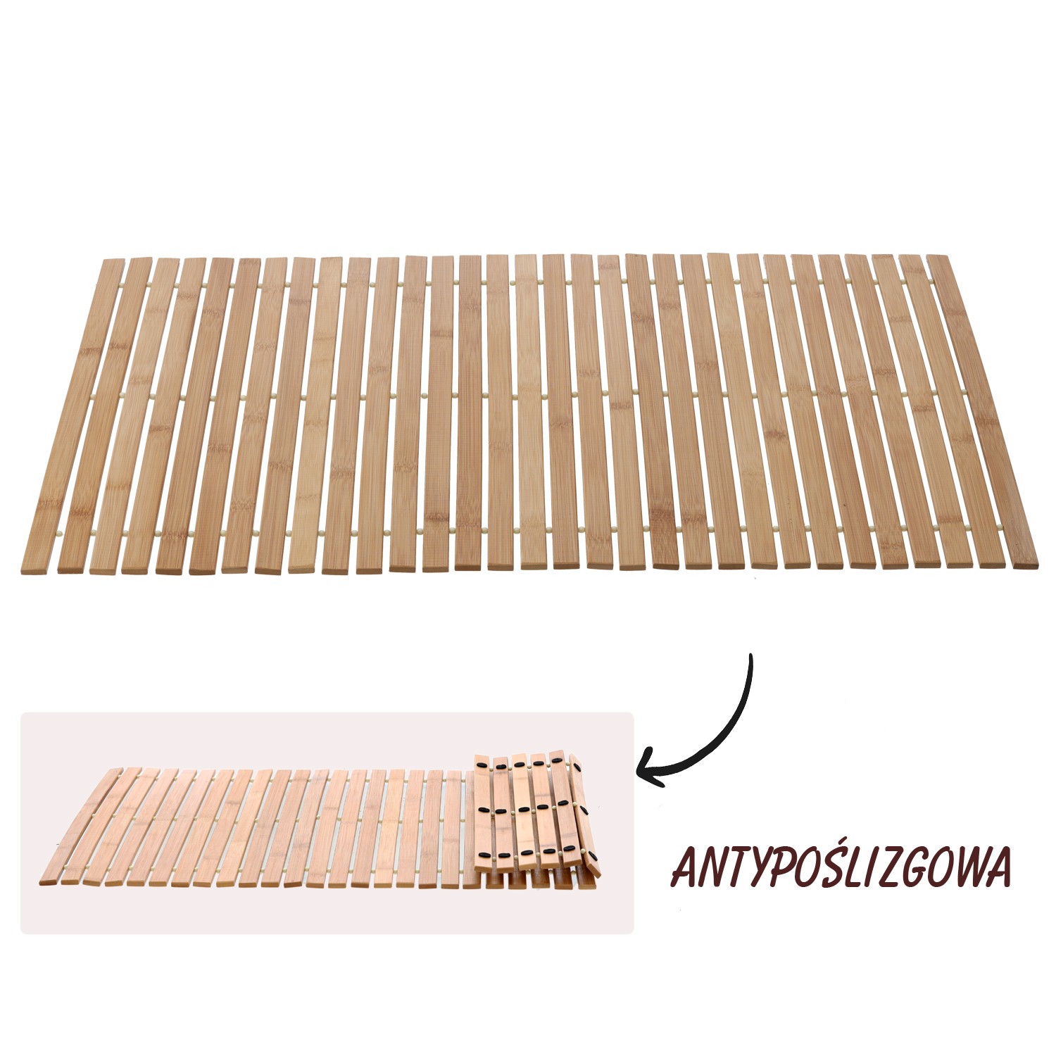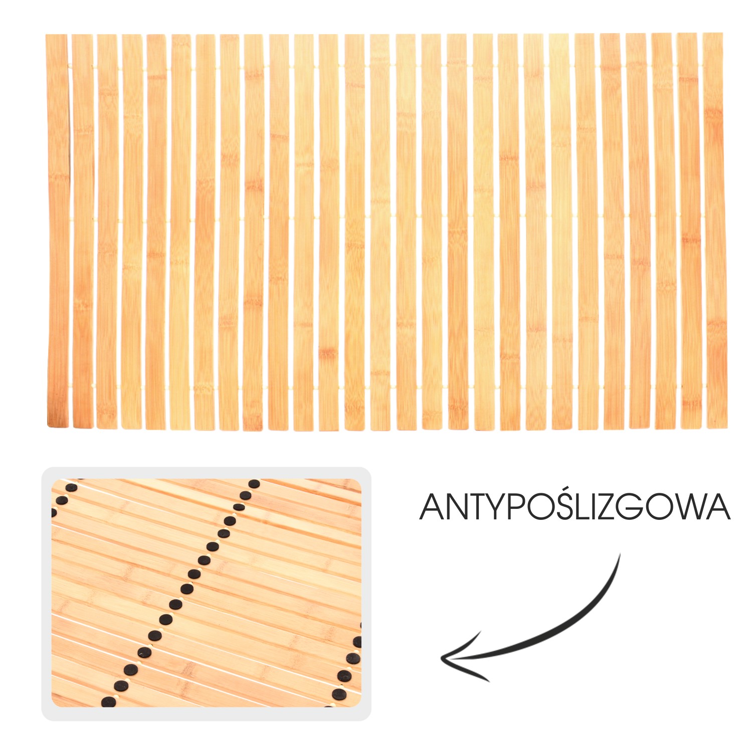 Бамбуковый коврик – это идеальный способ поддерживать порядок в вашей ванной комнате. Бамбуковое дерево обладает антибактериальными и противогрибковыми свойствами . Оно устойчиво к воздействию воды. Коврик изготовлен из гладких шлифованных бамбуковых планок и имеет противоскользящие прокладки из пеноматериала , благодаря которым вам не придется беспокоиться о безопасности членов вашей семьи. Ее естественный цвет делает ее практичной и неподвластной времени.