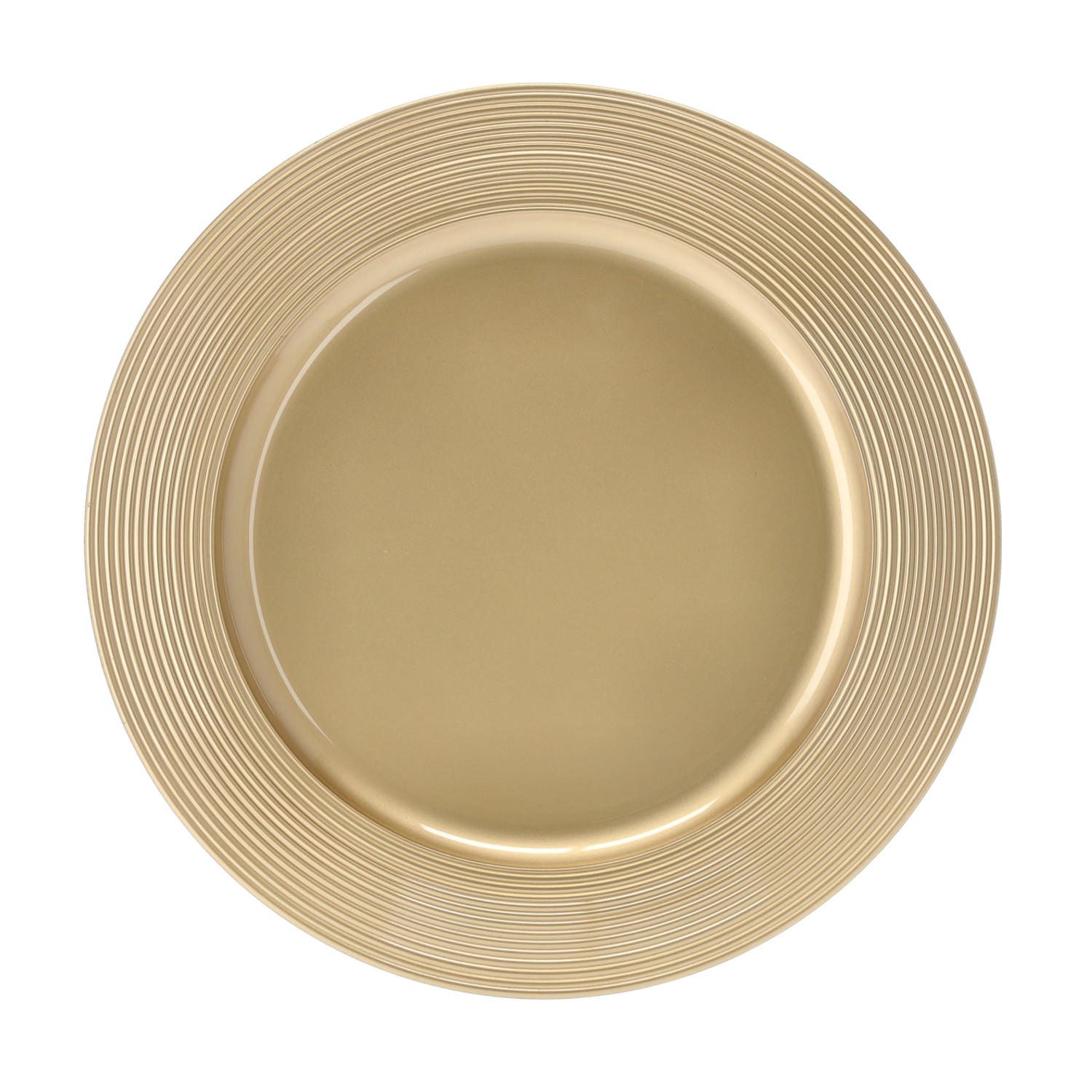 Позолоченная круглая тарелка из полипропилена диаметром 33 см и глубиной 2 см с желобками по краю.Предлагается возможность приобрести набор из 6 тарелок.Вес одного тарелка составляет 310 г.