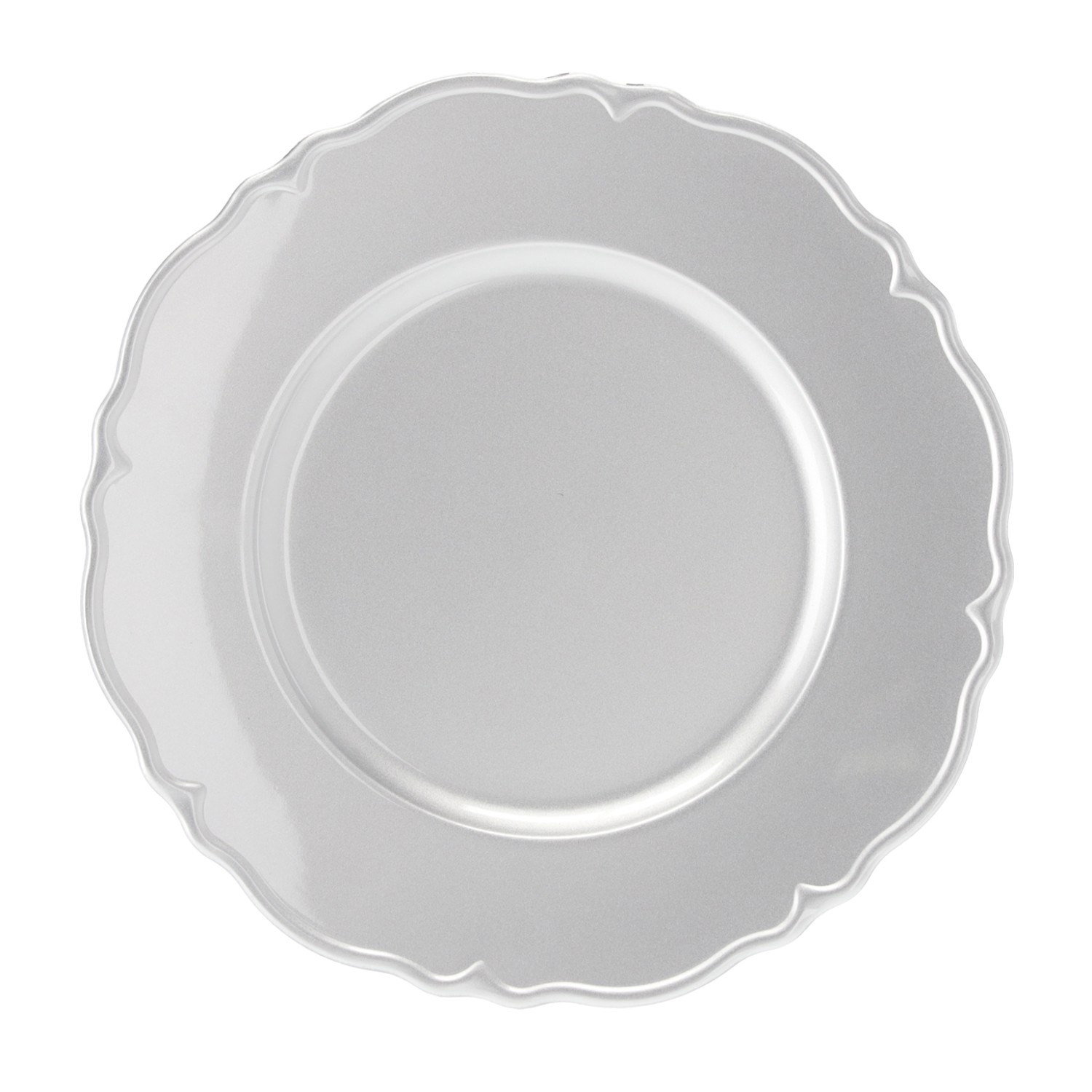 Посеребренная круглая тарелка из полипропилена диаметром 33 см и глубиной 2 см с узором по краю.Предлагается приобрести набор из 6 тарелок.Вес одного тарелки составляет 310 г.
