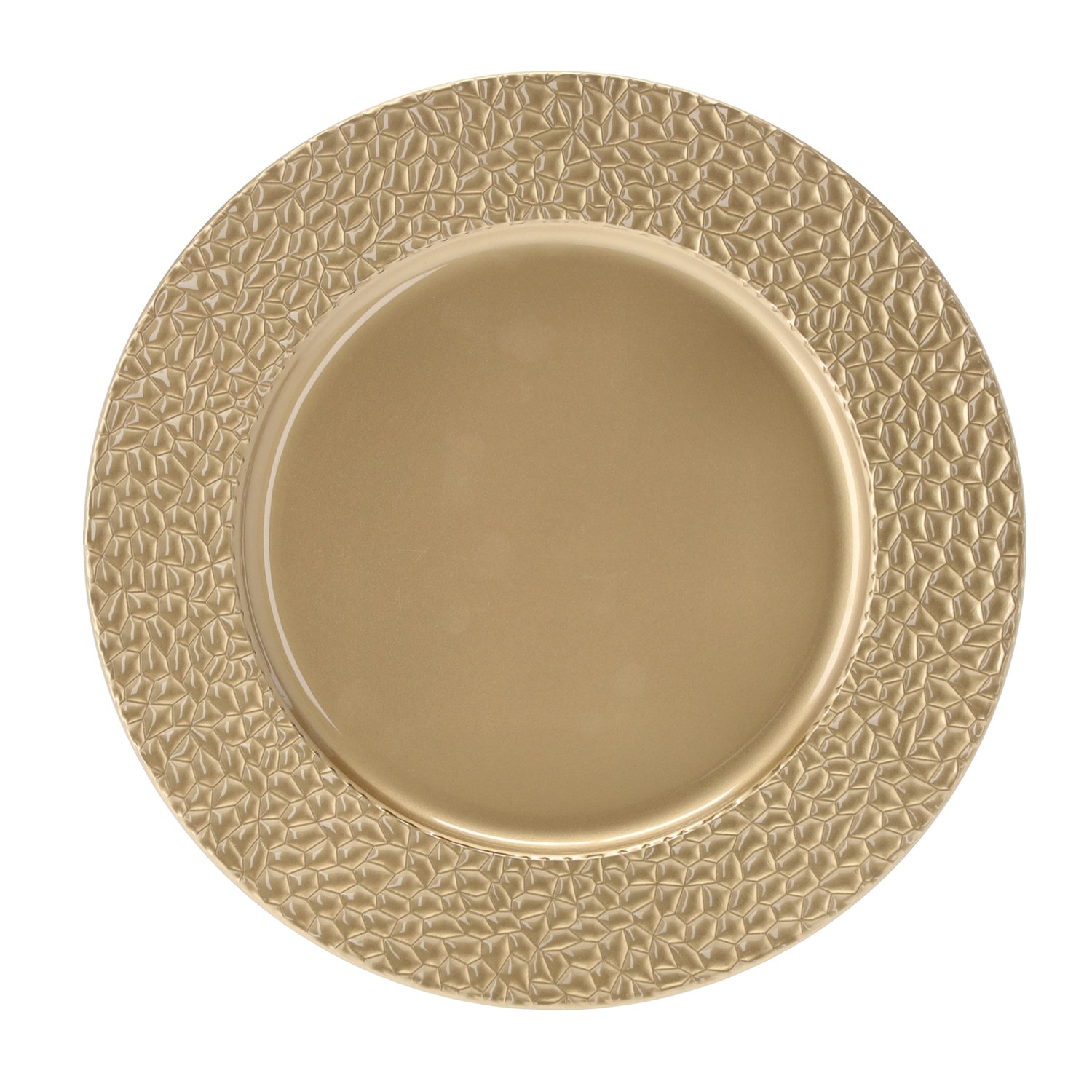 Позолоченная круглая тарелка из полипропилена диаметром 33 см и глубиной 2 см с шероховатым узором по краю.Предлагается возможность приобрести набор из 6 тарелок.Вес одного тарелка составляет 310 г.