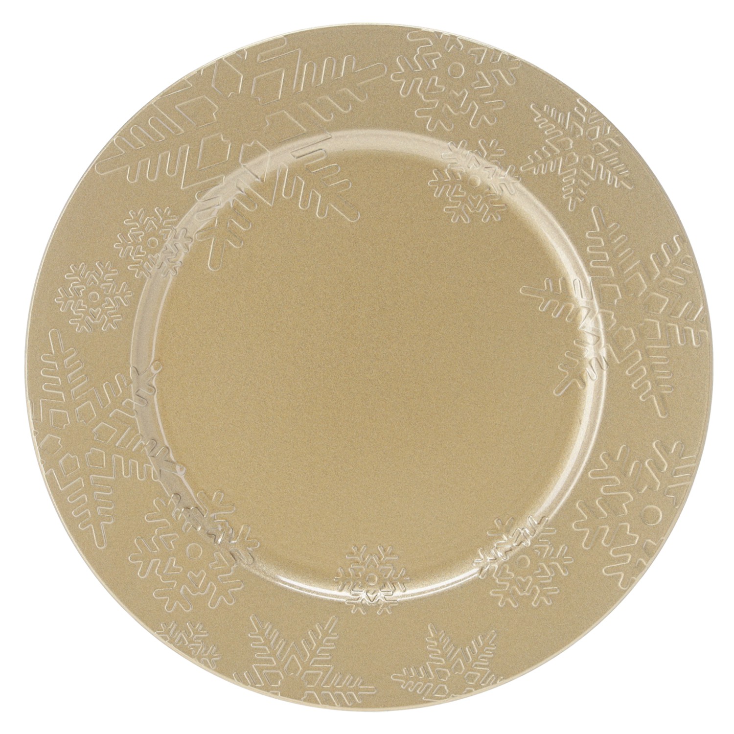 Позолоченная круглая тарелка из полипропилена диаметром 33 см и глубиной 2 см с рисунком в виде снежинок.Предлагается возможность приобрести набор из 6 тарелок.Вес одного тарелки составляет 310 г.