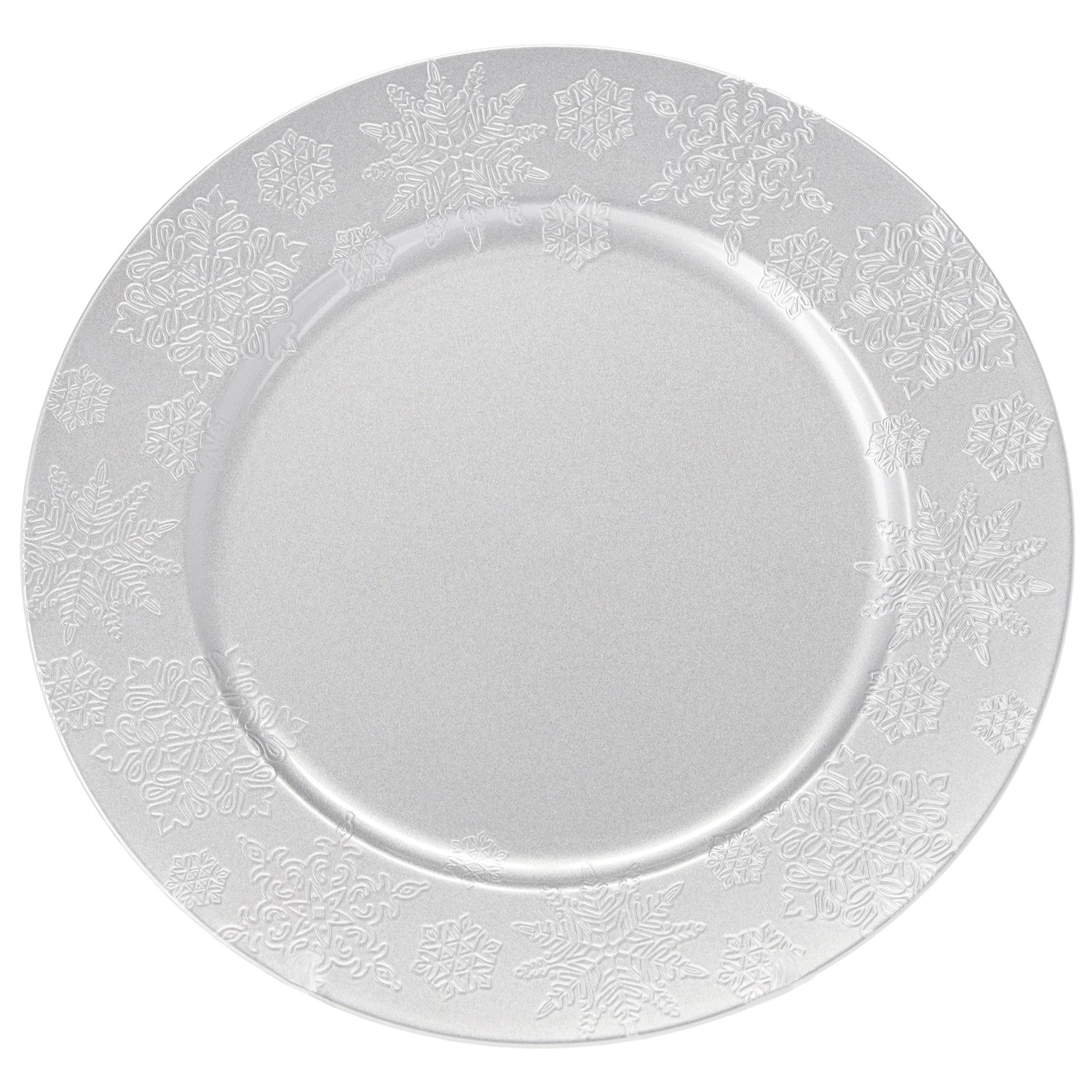 Посеребренная круглая тарелка из полипропилена диаметром 33 см и глубиной 2 см с рисунком в виде снежинок.Предлагается возможность приобрести набор из 6 тарелок.Вес одного тарелка составляет 310 г.