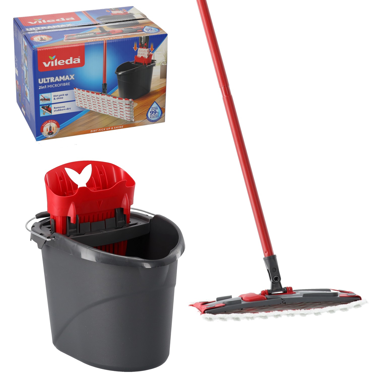 Плоская швабра UltraMax в комплекте со стандартным ведром с отжимником UltraMax, который позволяет отжимать и выжимать швабру, не пачкая и не моча руки.