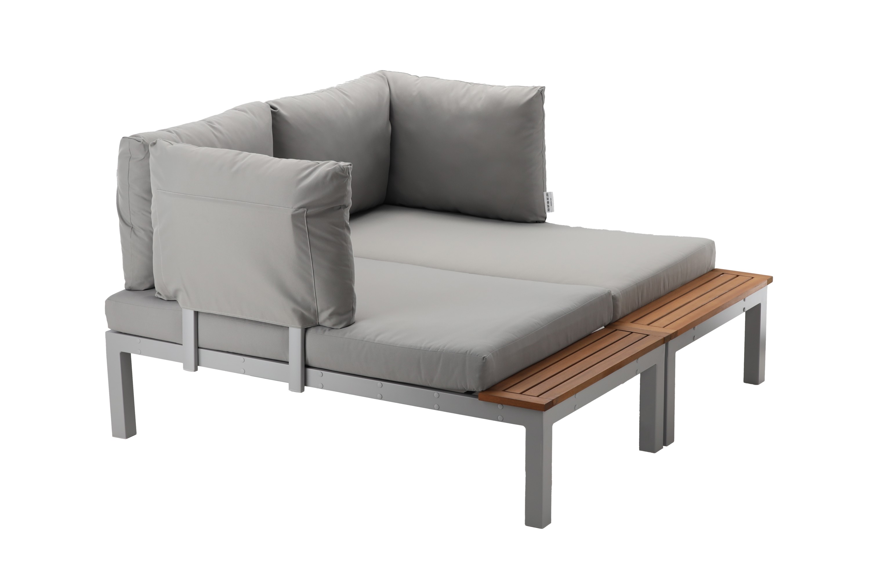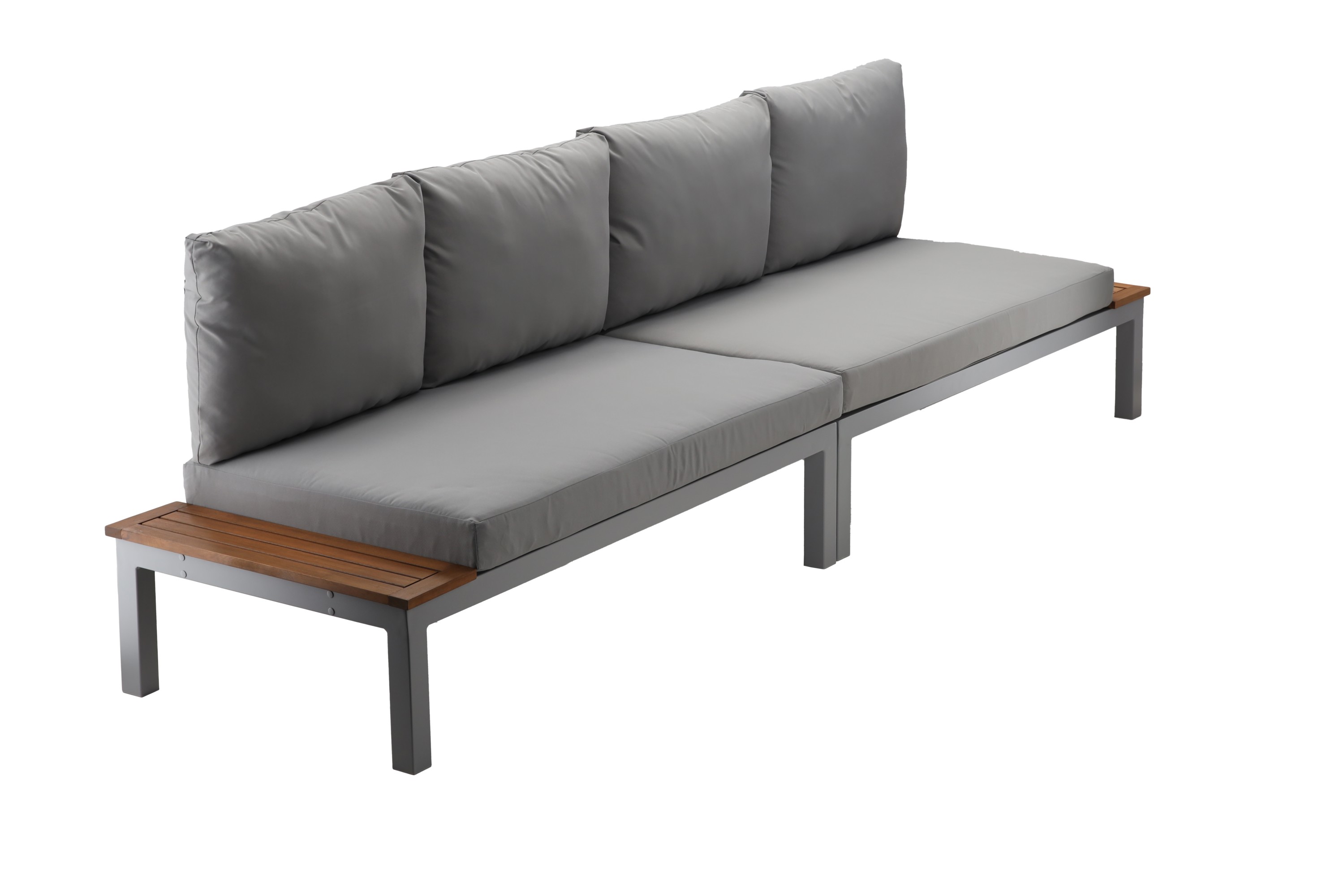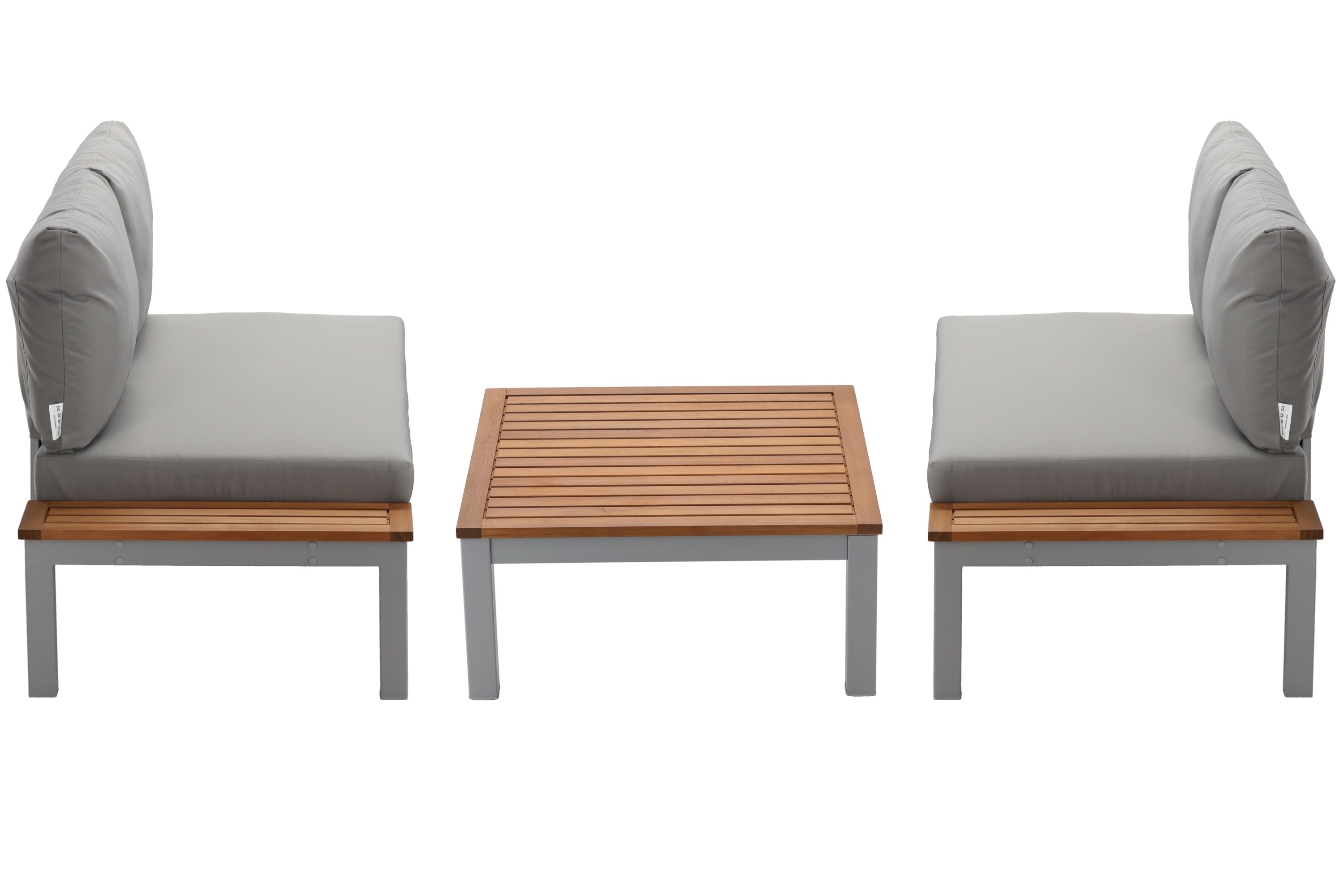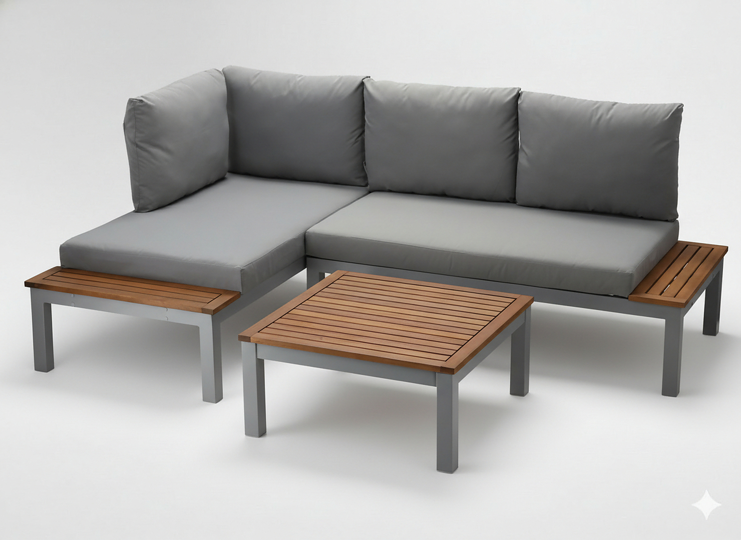 Набор модульной мебели представляет собой современное и функциональное решение для зоны отдыха. В комплект входят два модульных дивана и журнальный столик. Конструкция мебели основана на прочном алюминиевом каркасе, а деревянные элементы изготовлены из прочного эвкалипта. Ключевой особенностью комплекта является его модульность – деревянные элементы дивана (столешницы) и спинки подушек можно свободно переставлять, что позволяет создавать различные комбинации, адаптированные к индивидуальным потребностям и пространству. Благодаря этому комплект обеспечивает гибкость и комфорт использования как во время отдыха, так и во время дружеских встреч.- размеры дивана: 76,5 x 138 x 73 см- Размеры столика: 71,5 x 71,5 x 32,5 см- каркас: алюминий- деревянные элементы: эвкалиптовое дерево