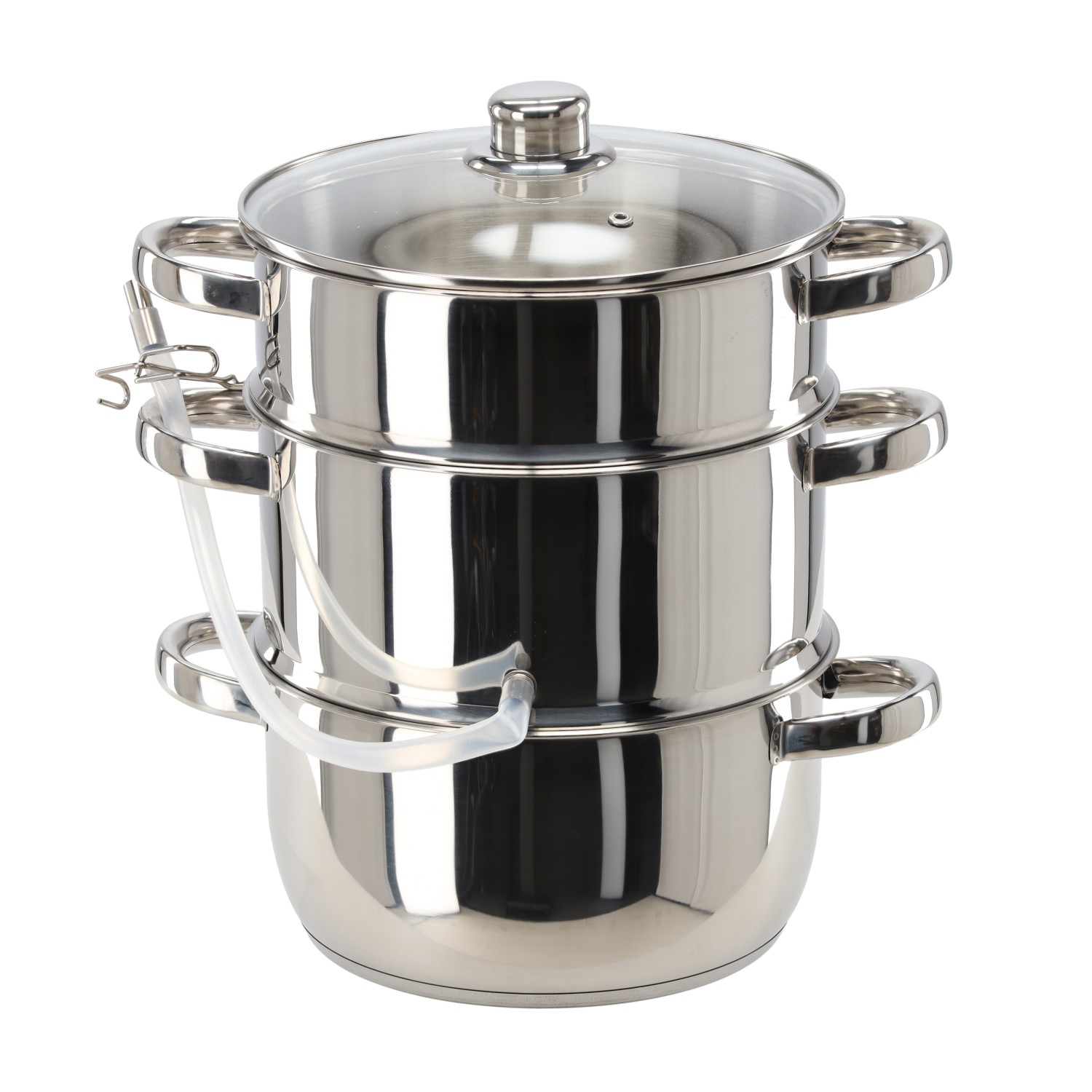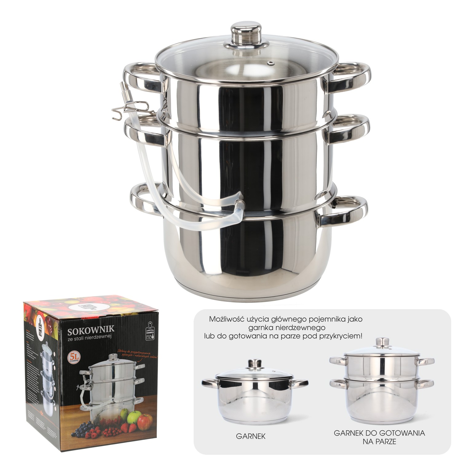Высококачественный соковыжиматель из нержавеющей стали объемом 5 литров, оснащенный тремя функциями: соковыжималка, кастрюля с крышкой и кастрюля для приготовления на пару. Идеально подходит для приготовления свежих соков и приготовления на пару. Возможность мытья в посудомоечной машине обеспечивает удобство использования.