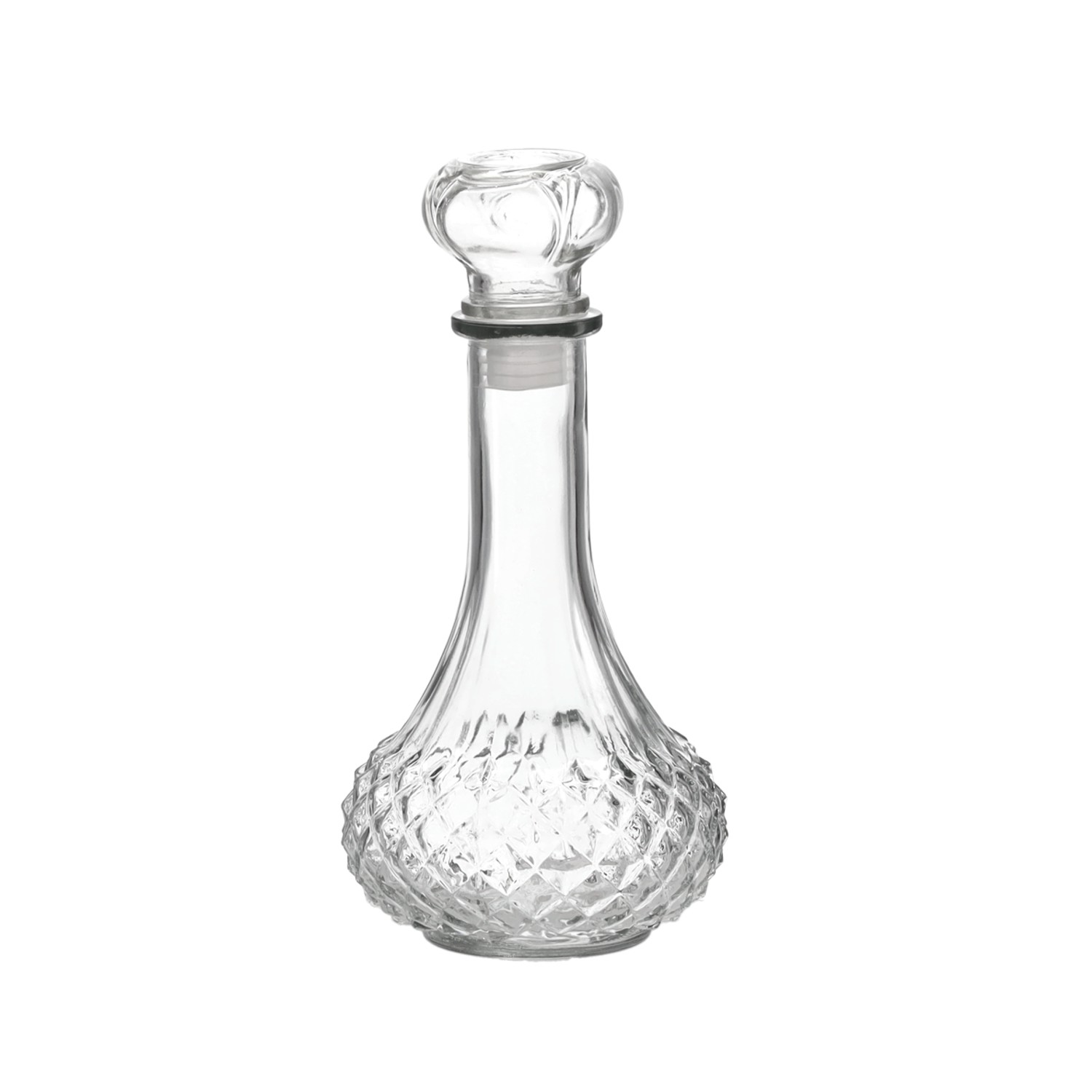 Эффектная и изящная карафа из декоративного стекла. Закрывается стеклянной пробкой с пластиковым уплотнителем, обеспечивающим полную герметичность. Может стать прекрасным дополнением к барным аксессуарам.