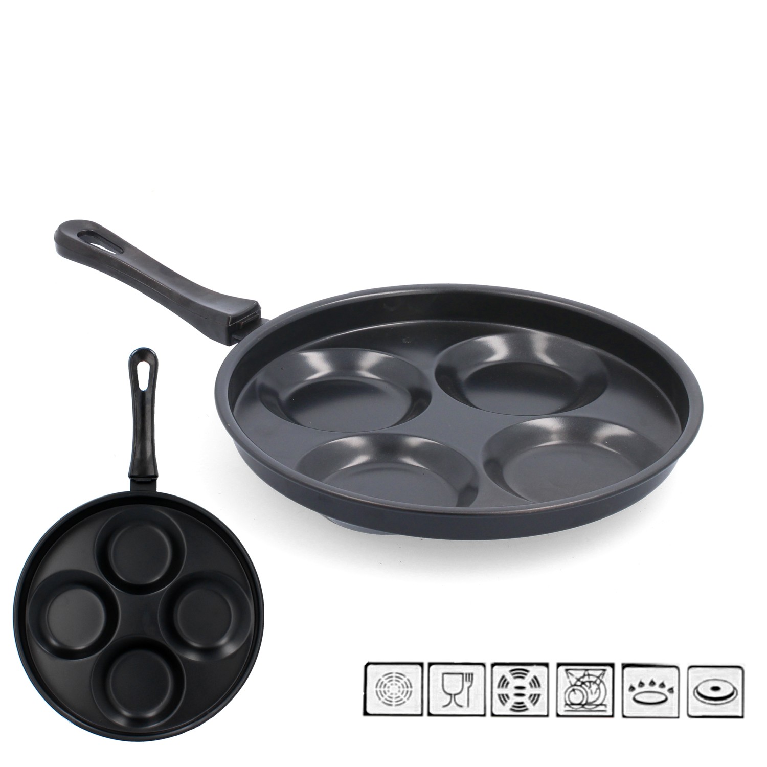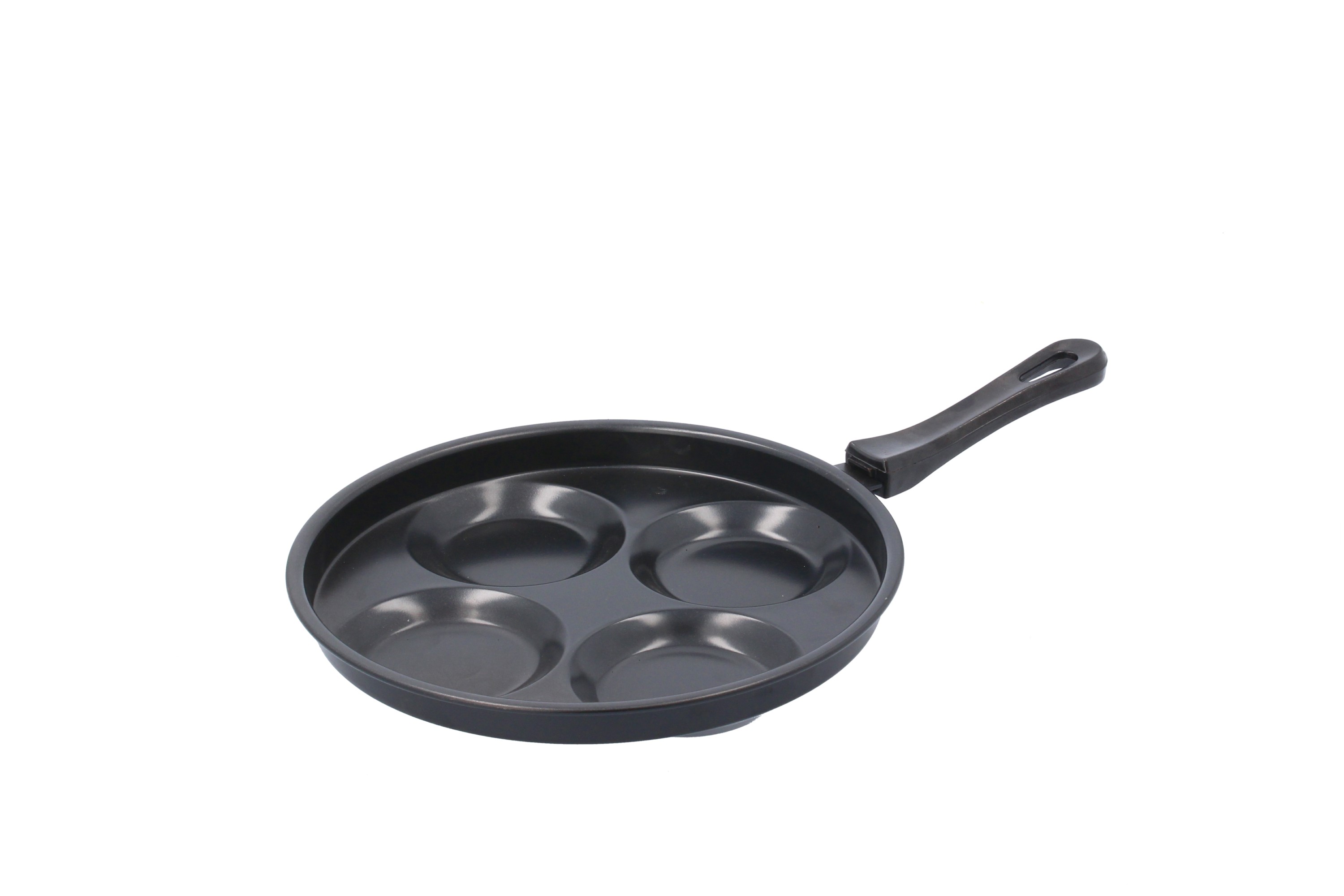 Сковорода для яиц из углеродистой стали толщиной 0,8 мм. Внутренняя поверхность сковороды покрыта черным антипригарным покрытием, а внешняя поверхность изготовлена из термостойкого материала. Удобная ручка из пластика обеспечивает комфорт при использовании.