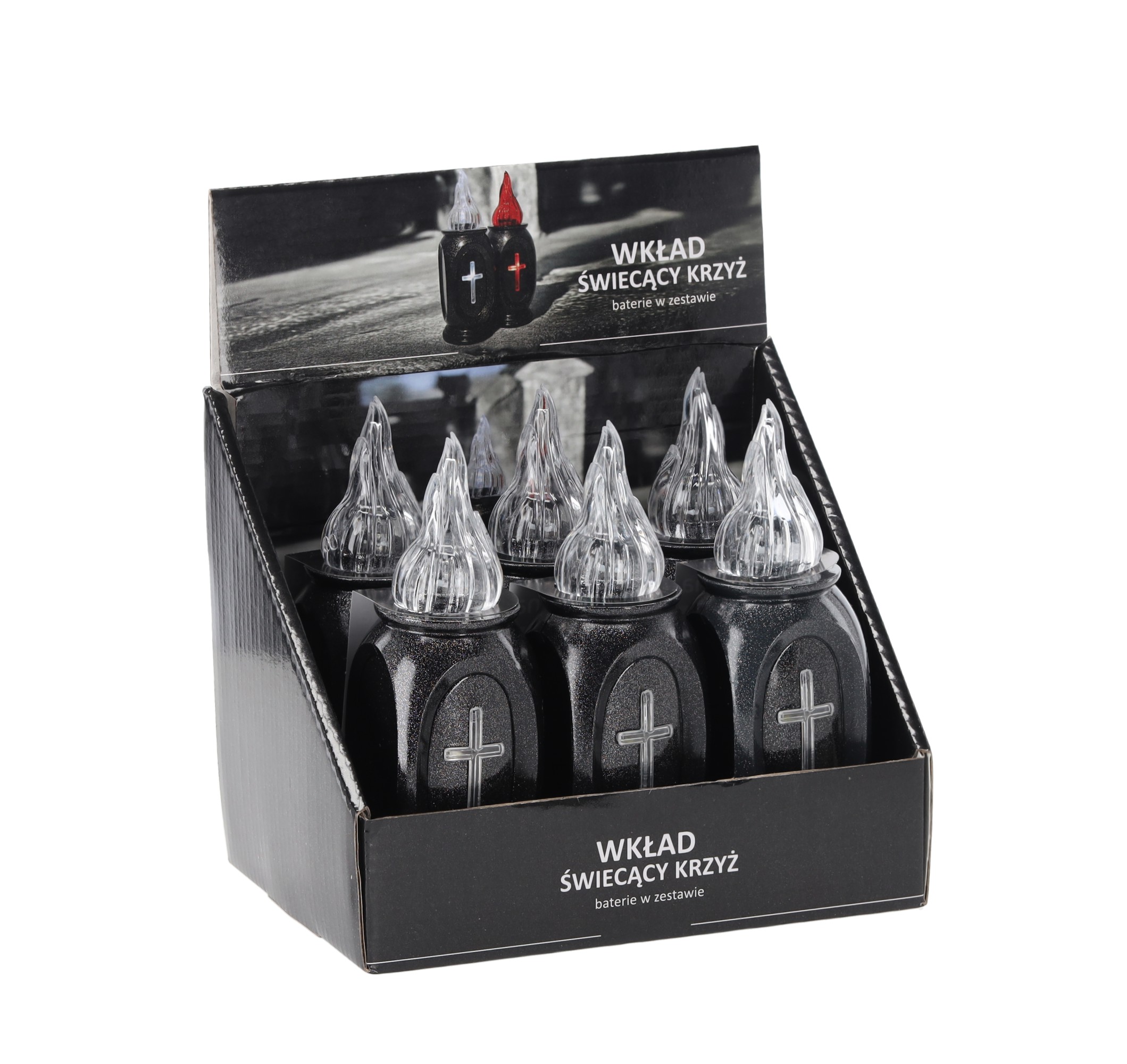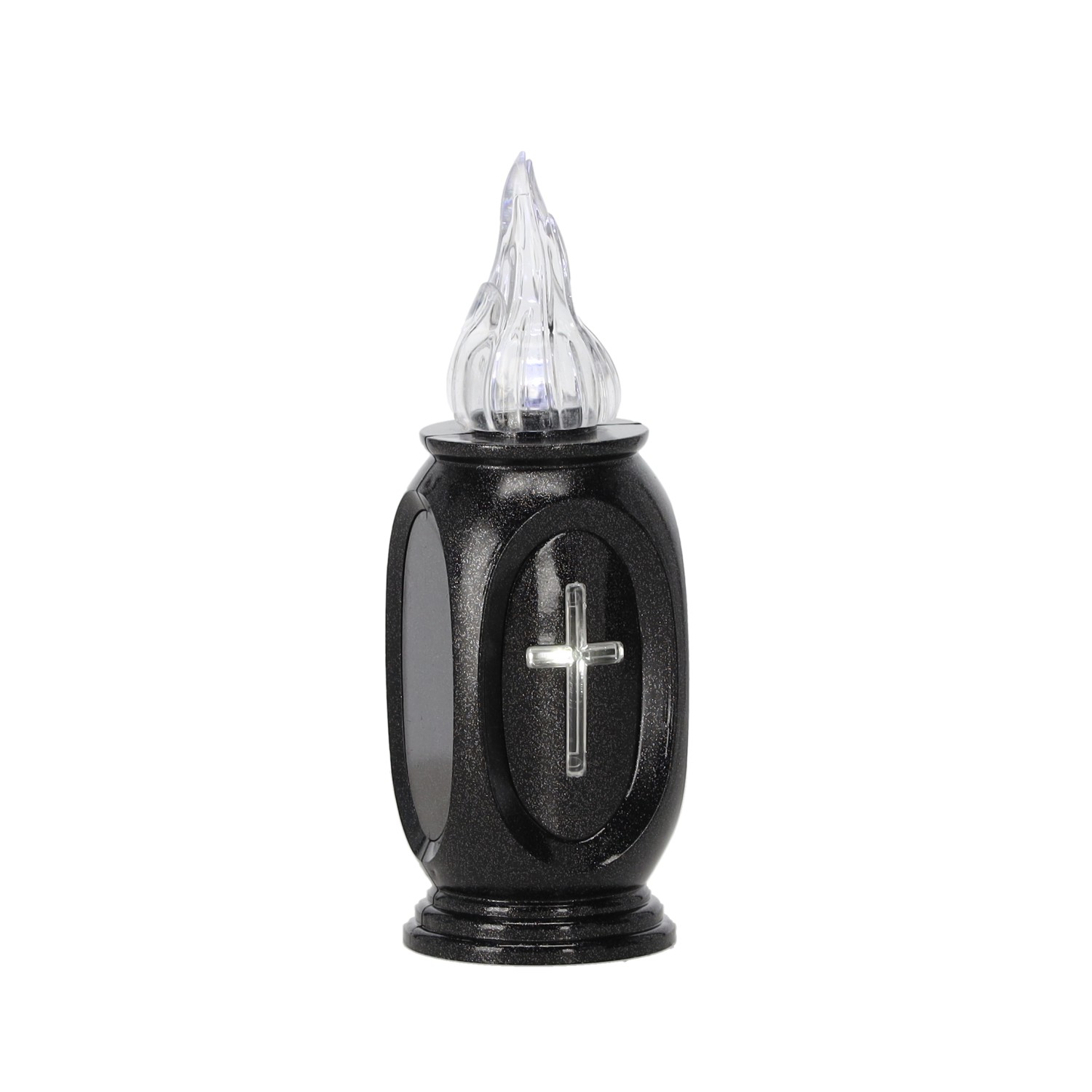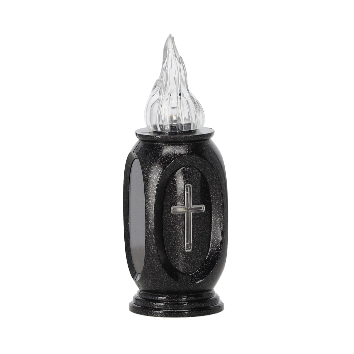 Светодиодная вставка Vaso с светящимся мотивом креста, гранитного цвета, излучающая холодный белый свет. Обеспечивает устойчивое и мягкое освещение, идеально подходит для надгробных свечей.