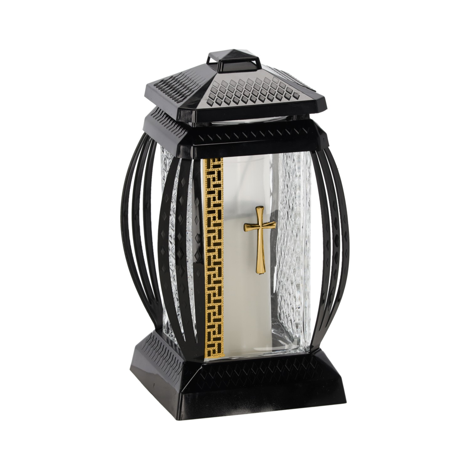 Свеча высотой 28 см, модель Prima Vera, украшенная пайетками и мотивом креста в золотом и серебряном цветах. Обеспечивает пламя до 45 часов, сочетая в себе элегантность и функциональность. Идеально подходит для украшения надгробий.