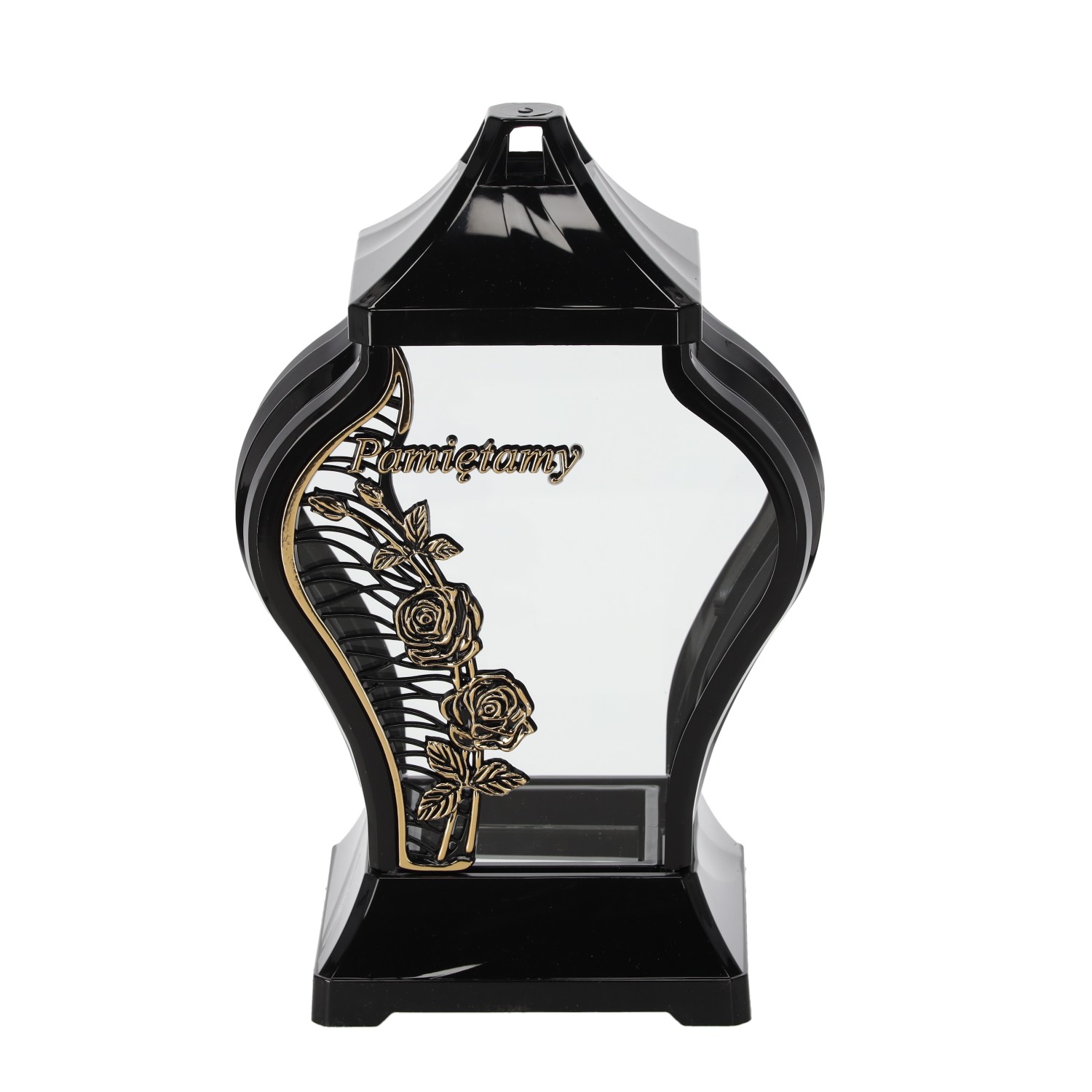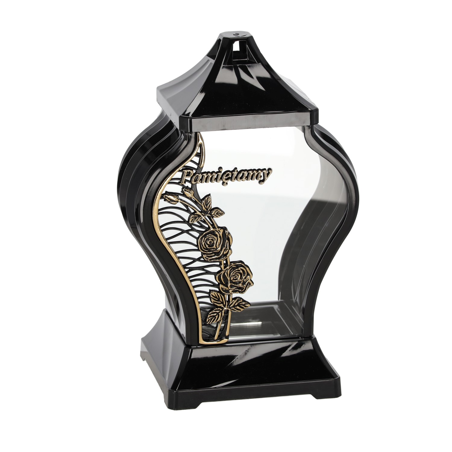Фонарь высотой 30 см с мотивом маленькой плетистой розы, в черно-золотых тонах. Элегантный и практичный, идеально подходит для украшения надгробий.