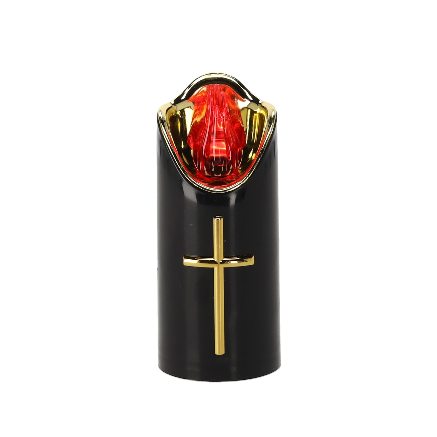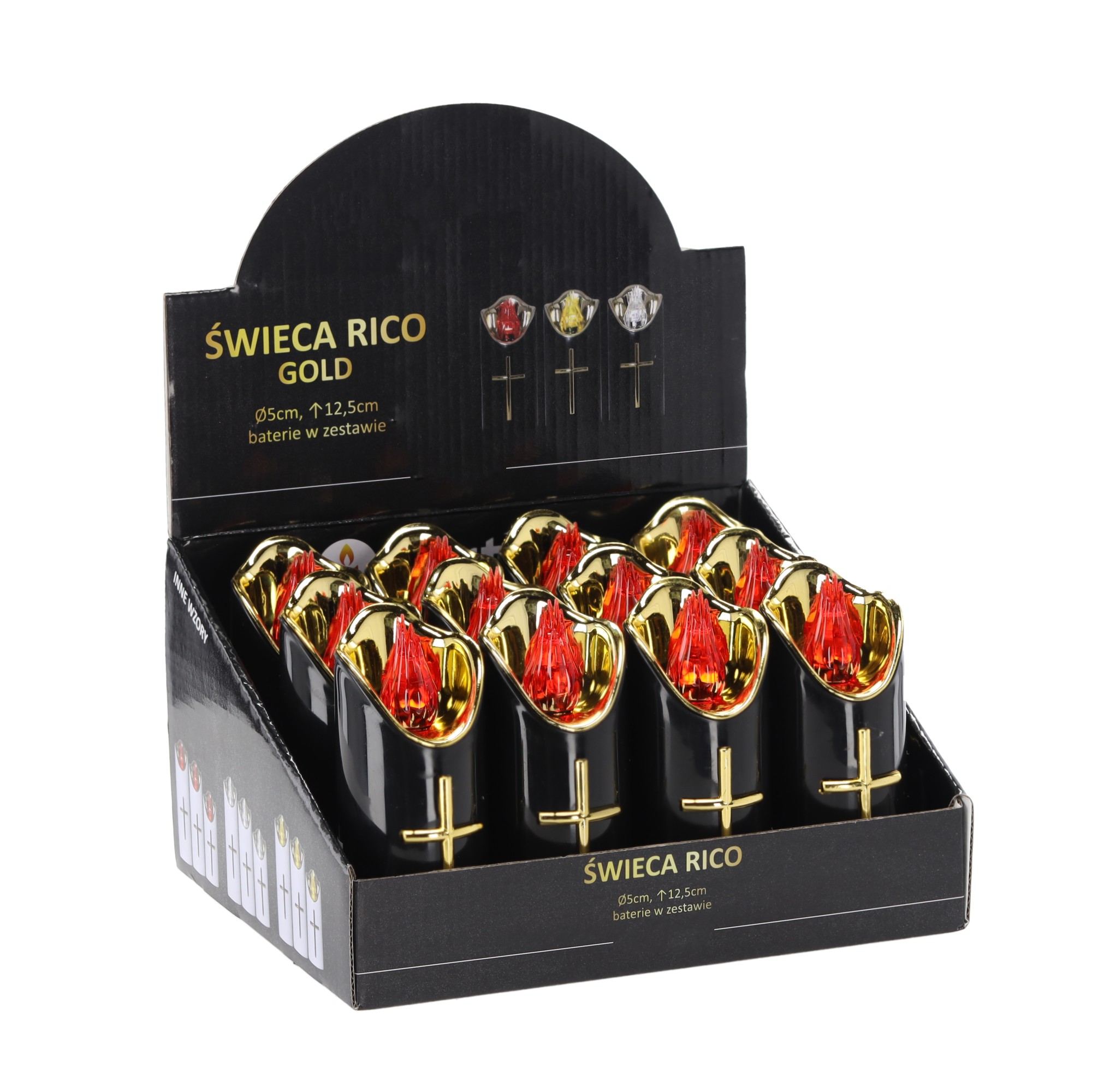 Свеча LED модели Rico высотой 12,5 см, черного и золотого цвета, излучающая красный пламя. Питается от батареек, которые обеспечивают длительное и безопасное освещение. Идеально подходит для украшения надгробий и интерьеров.