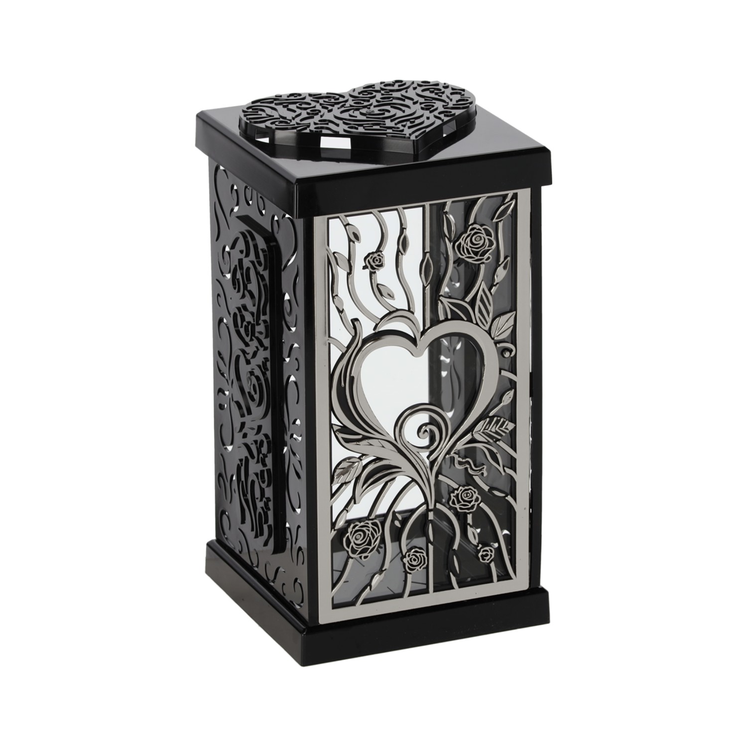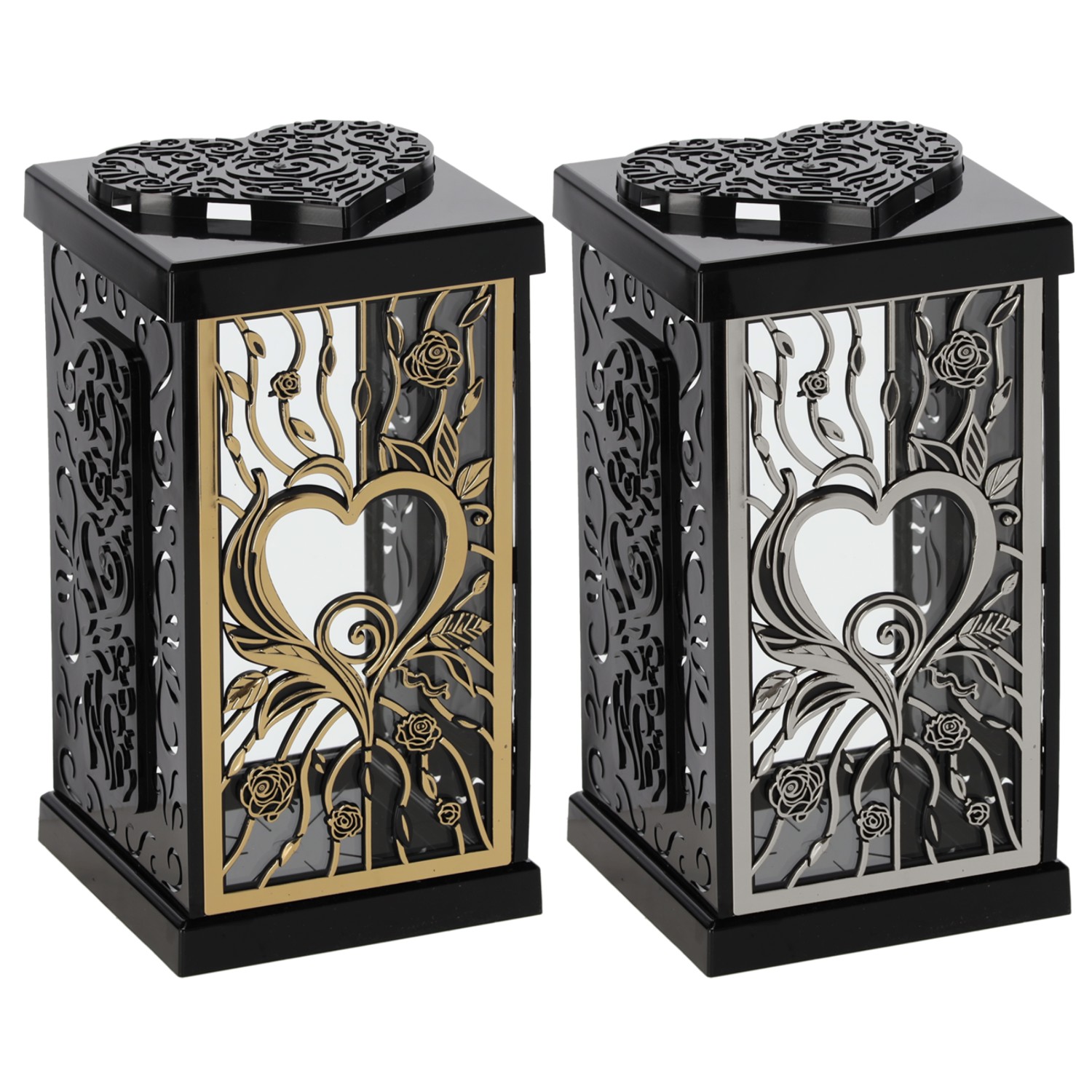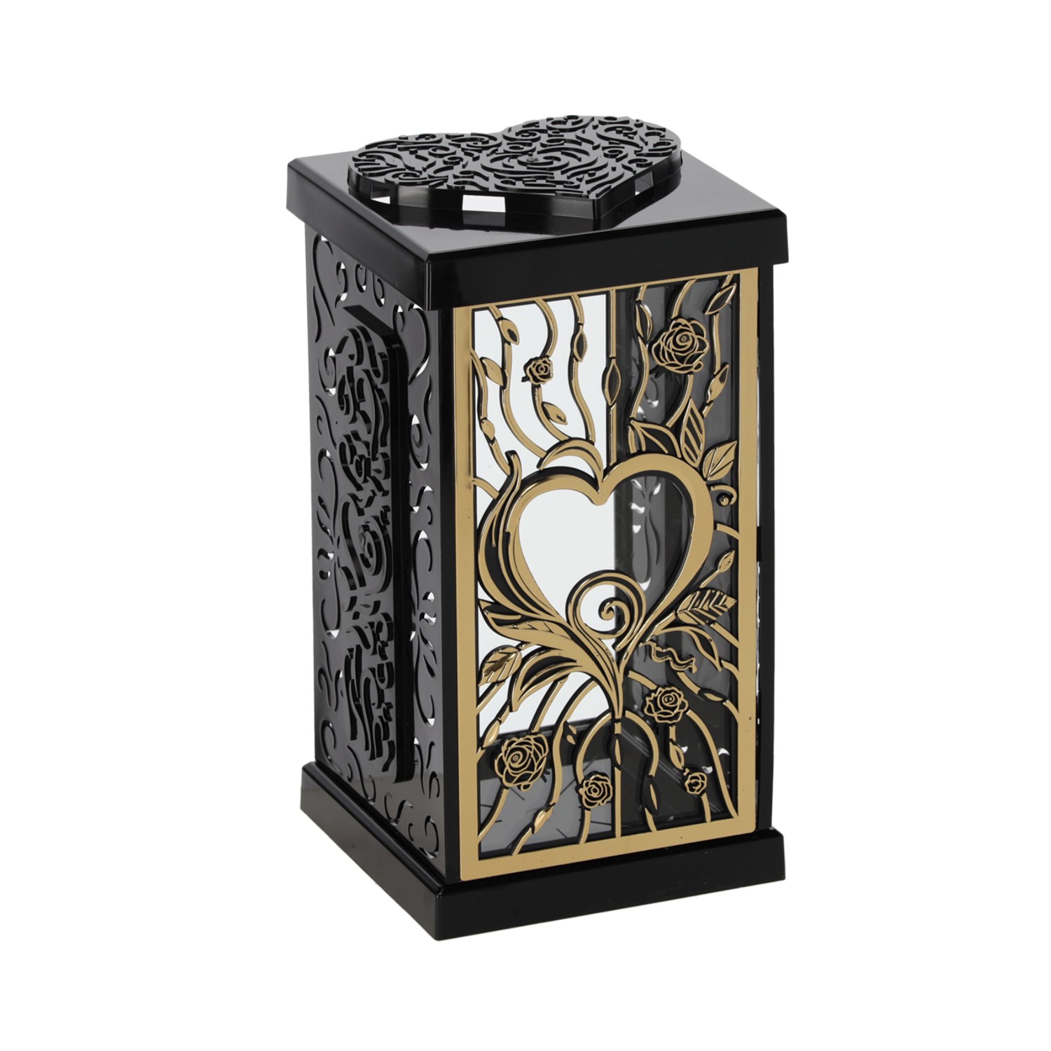 Фонарь высотой 30 см с крупным мотивом розы, в черном, серебряном и золотом цветах. Элегантный и функциональный, идеально подходит для украшения надгробий.