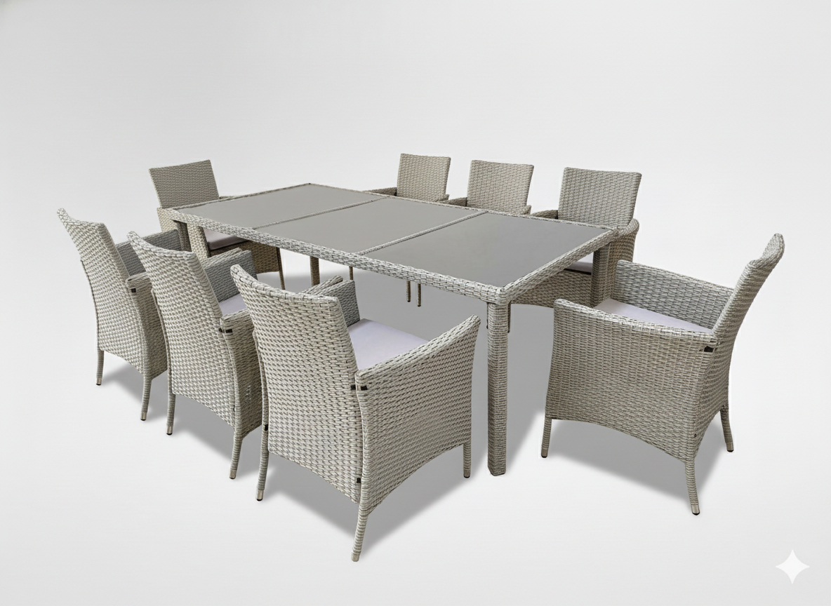Элегантный обеденный набор, состоящий из 8 стульев и большого стола. Изготовлен из высококачественных материалов, обеспечивает долговечность и устойчивость к погодным условиям. Стальная оцинкованная рама гарантирует стабильность конструкции, а ротанг добавляет эстетичный вид. Водонепроницаемый материал подушек повышает комфорт использования, а закаленное стекло на столешнице подчеркивает современный дизайн.