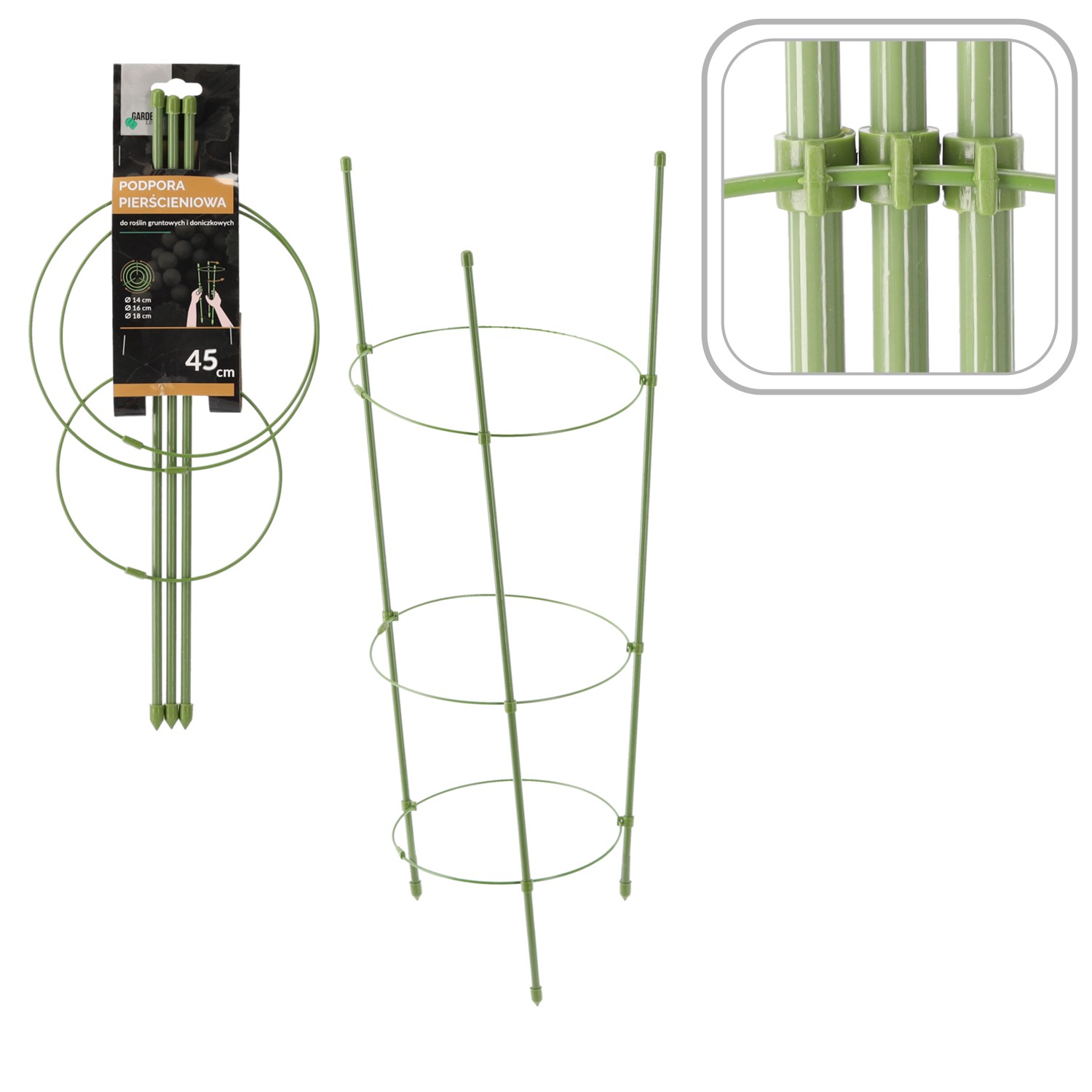 Кольцевая опора с столбиками является отличным решением для комнатных растений и клумб. Благодаря прочному металлическому исполнению и пластиковому покрытию она очень устойчива к повреждениям и неблагоприятным погодным условиям, а благодаря зеленому цвету становится практически незаметной на фоне растений. Полезна, в частности, при выращивании: американской голубики, гортензии. Предотвращает «лежание» растения и обеспечивает его гармоничный рост. Кольцевая опора может быть интересной альтернативой различным типам одиночных кольев. Зеленый цвет продукта идеально сочетается с растениями, а также служит украшением садов. Опору следует установить в землю рядом с растением и привязать к ней стебель, таким образом обеспечив отличную стабилизацию и защиту от поломки даже в ветреную погоду.