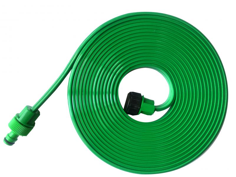 Зеленый шланг — это лента с отверстиями, через которые просачивается вода. Перфорированная труба была разработана для бережного полива растений в саду с помощью специального метода. Внутри находятся три меньшие трубки, через которые протекает вода. По всей длине шланга через равные промежутки расположены крошечные отверстия, через которые вытекает вода. Шланг имеет пластиковый наконечник, благодаря которому его подключение к источнику воды осуществляется быстро и удобно.