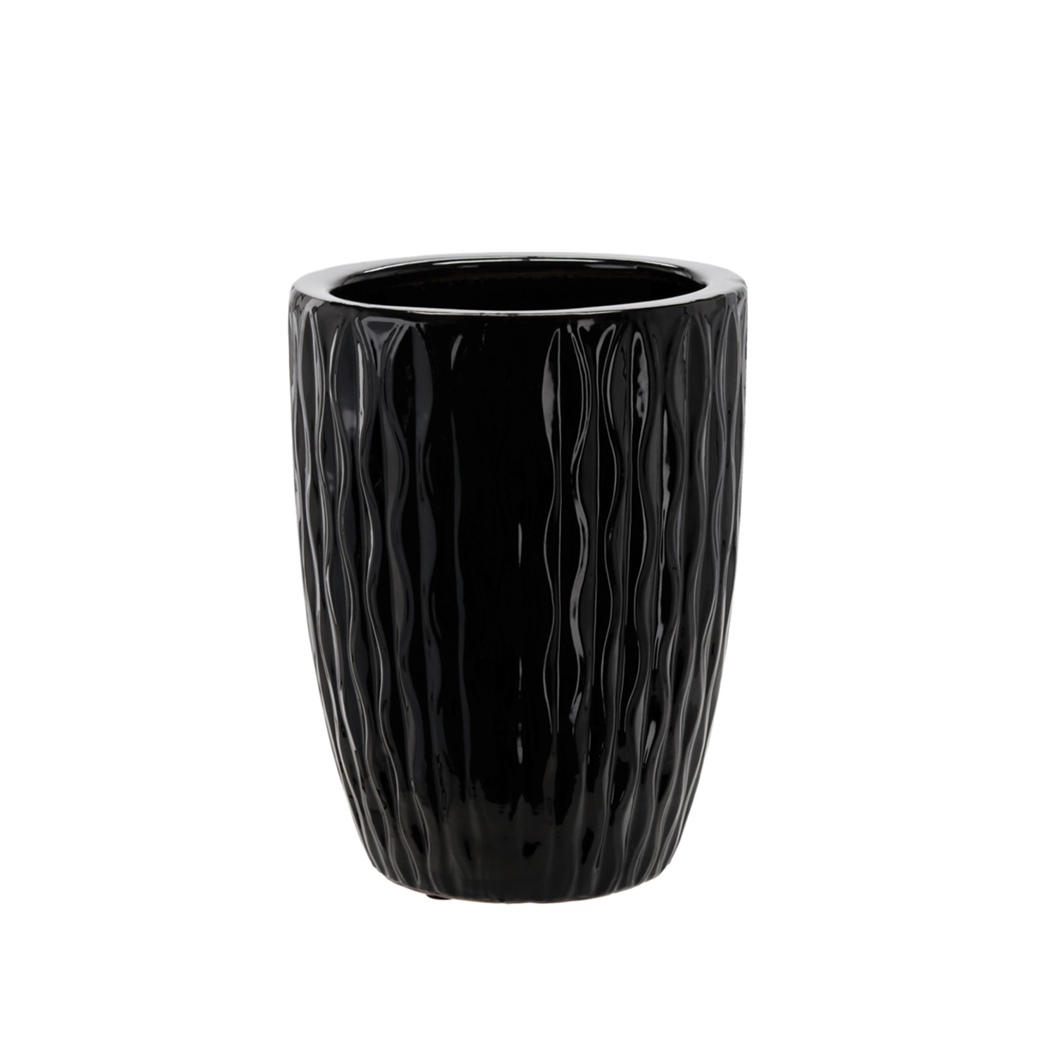 Элегантный керамический кашпо в блестящем черном цвете является прекрасным дополнением к интерьеру. Его гладкая, блестящая поверхность придает современный характер, а глянцевая отделка красиво отражает свет, добавляя элегантности любому интерьеру.