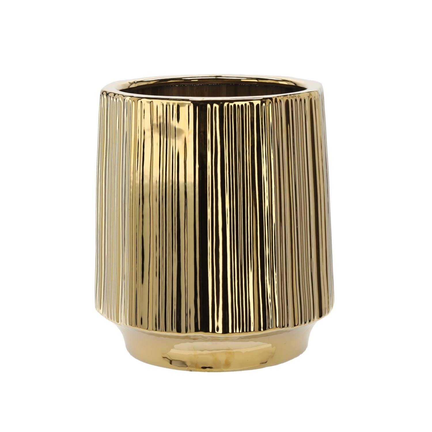 Современный керамический кашпо с золотым блеском и рифленой поверхностью - идеальный выбор для ценителей элегантного интерьера. Его тонкие бороздки придают уникальную текстуру, а блестящая отделка добавляет роскошный акцент. Идеально подходит для демонстрации зеленых растений и цветов в горшках.