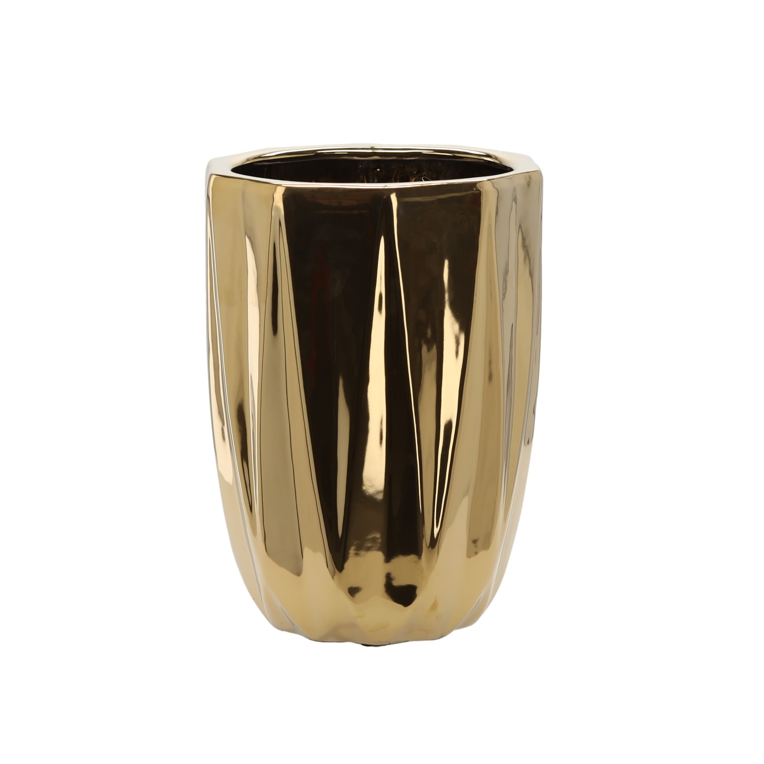 Элегантный керамический кашпо блестящего золотого цвета станет прекрасным дополнением интерьера. Его тонко рифленая поверхность придает интересную текстуру, а блестящая отделка красиво отражает свет. Вертикальные рифления подчеркивают его уникальный характер и придают современный вид.