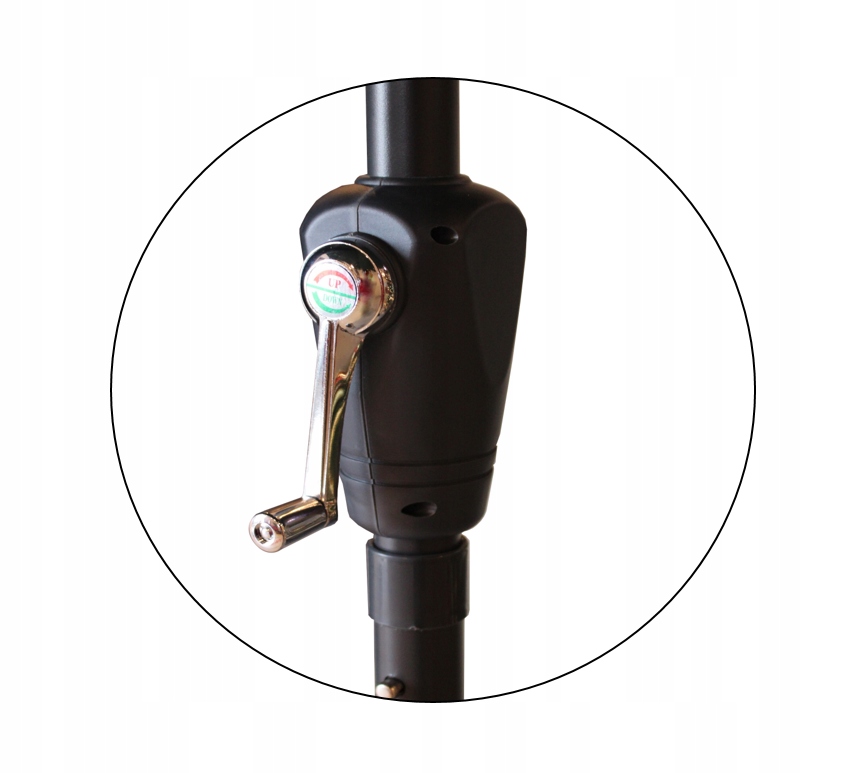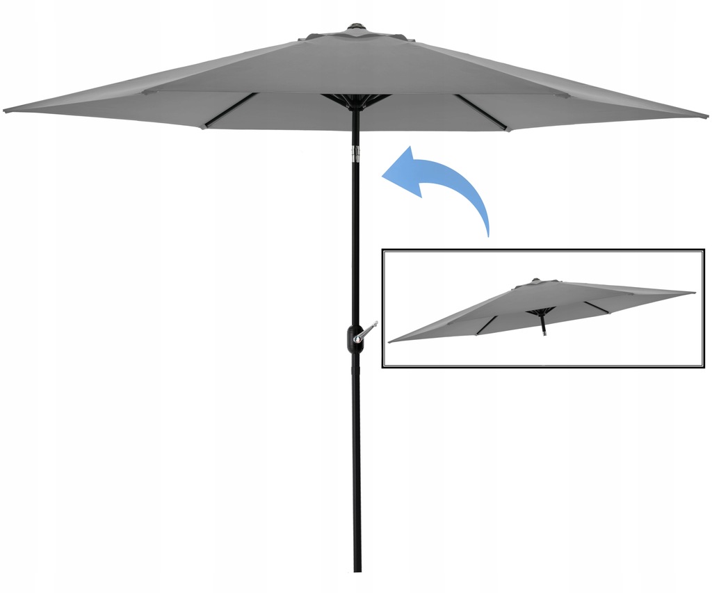 Зонт изготовлен извысококачественных материалов. Использована водонепроницаемая ткань, благодаря чему он устойчив к погодным условиям. Складывание и раскладывание осуществляется с помощью рукоятки. Имеетфункцию наклона.