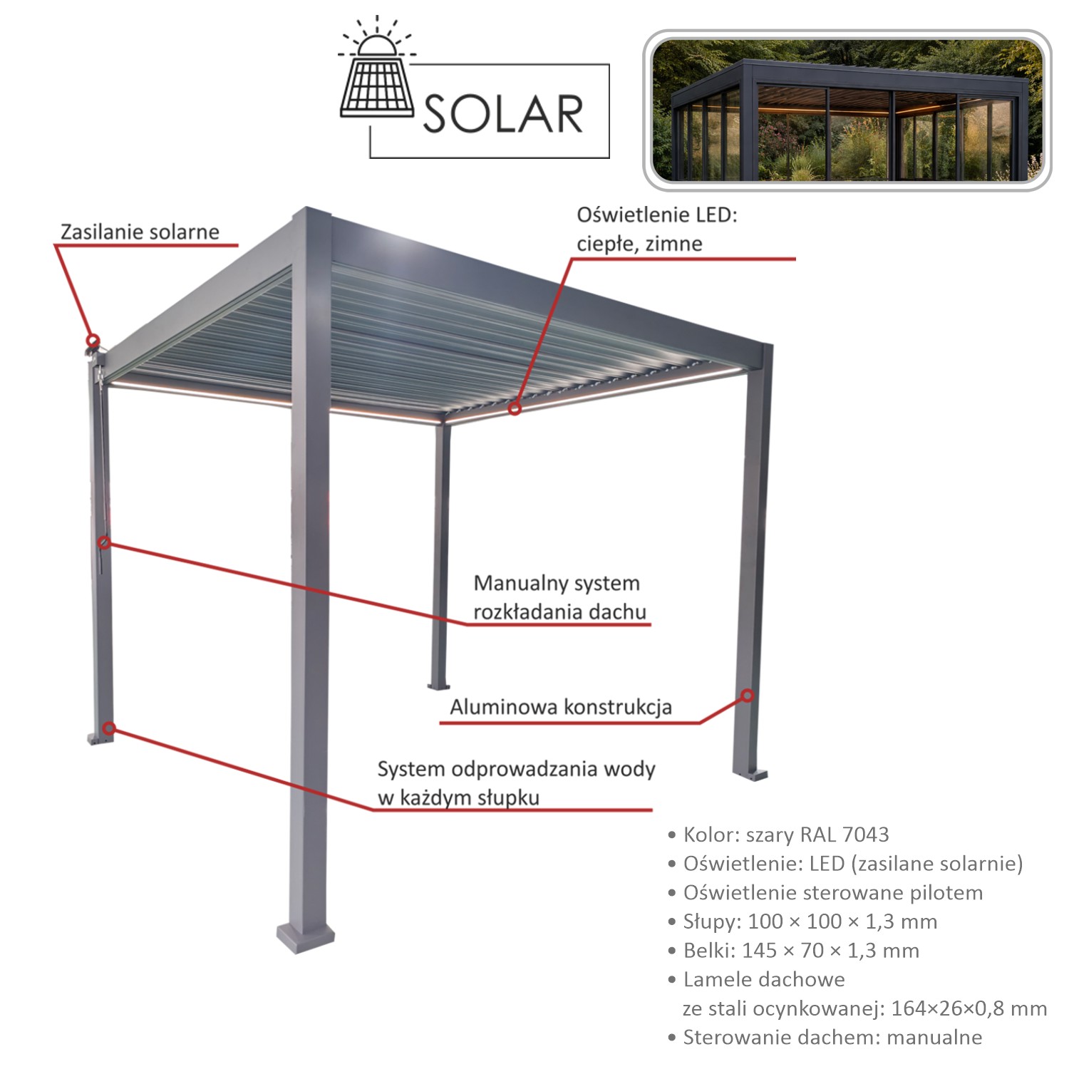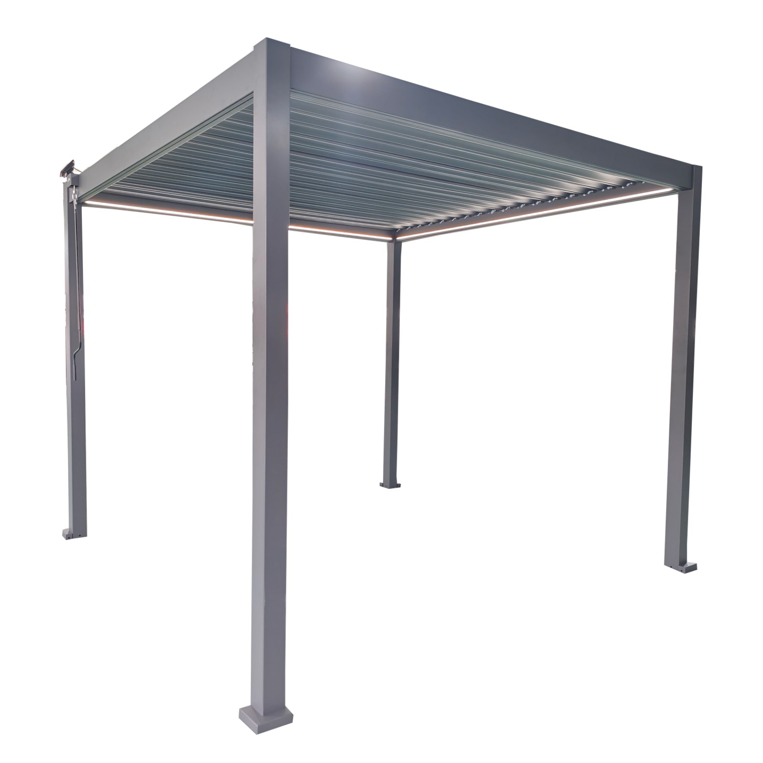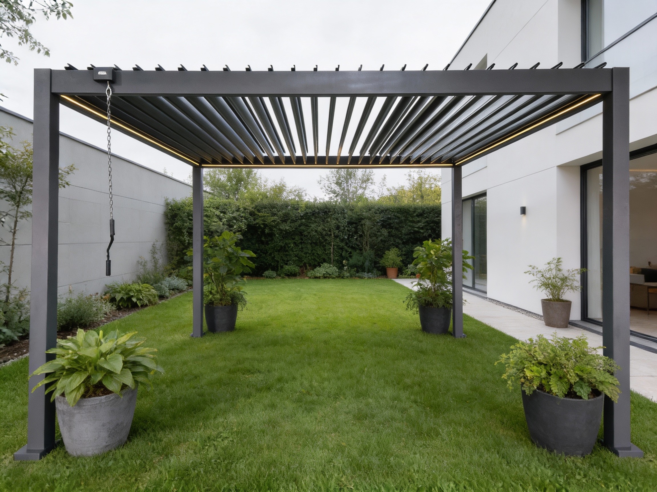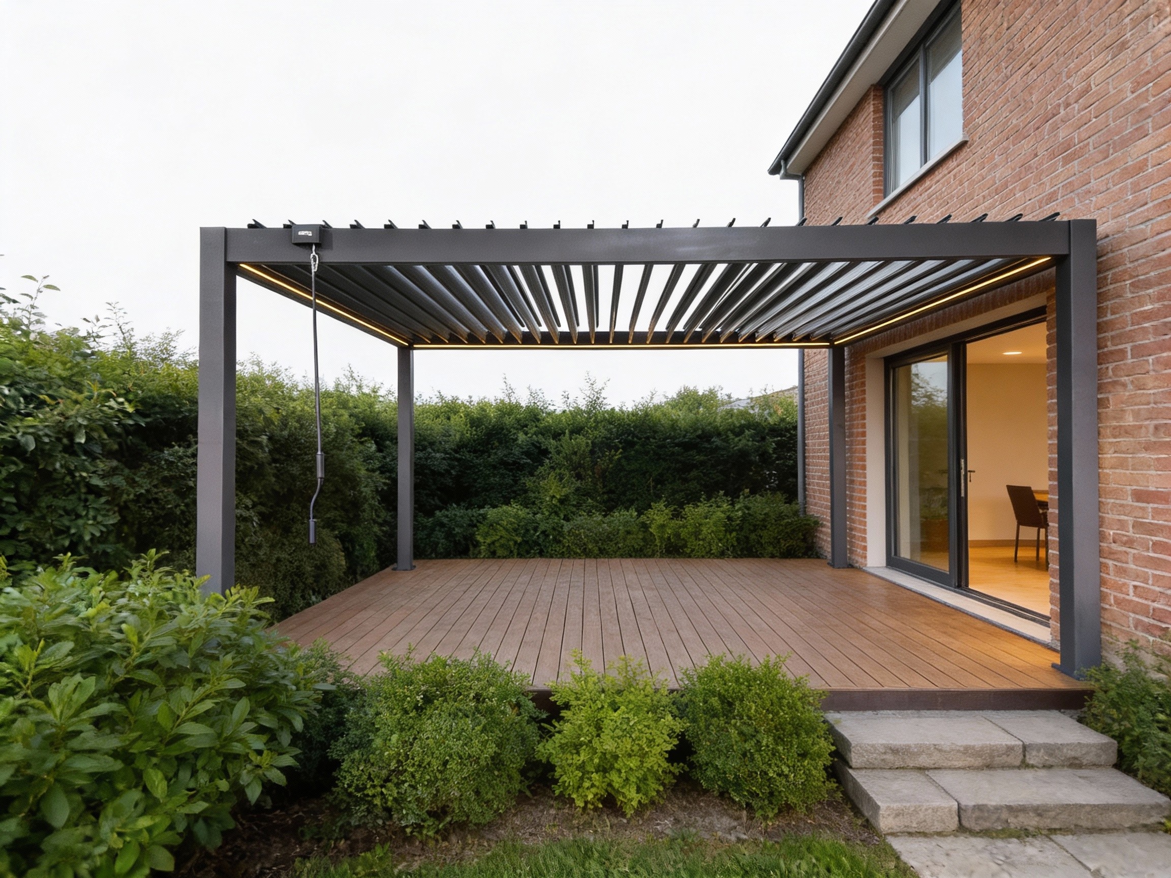 Пергола оснащена регулируемой крышей с оцинкованными стальными ламелями и встроенным светодиодным освещением, питающимся от солнечной батареи, которое создает приятную атмосферу после захода солнца 🌙✨. Ручное управление крышей позволяет точно регулировать количество света и вентиляцию, обеспечивая идеальные условия для отдыха независимо от погоды.
