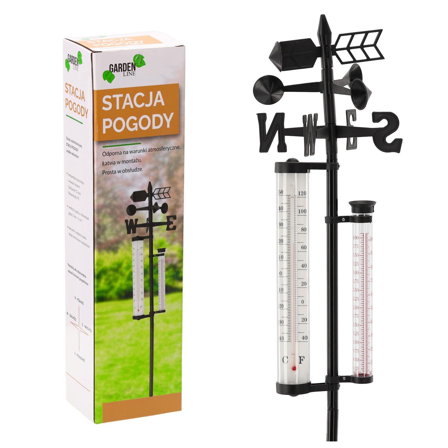 Садовая метеостанция. Благодаря метеостанции, которая прекрасно впишется в сад или участок, мы можем измерять температуру, количество осадков и направление ветра с помощью обозначений СЕВЕР, ЮГ, ВОСТОК, ЗАПАД, которые необходимо предварительно разместить в соответствующих направлениях. Изготовленная из высококачественного пластика, устойчивого к атмосферным воздействиям, она прослужит вам долго в вашем саду.