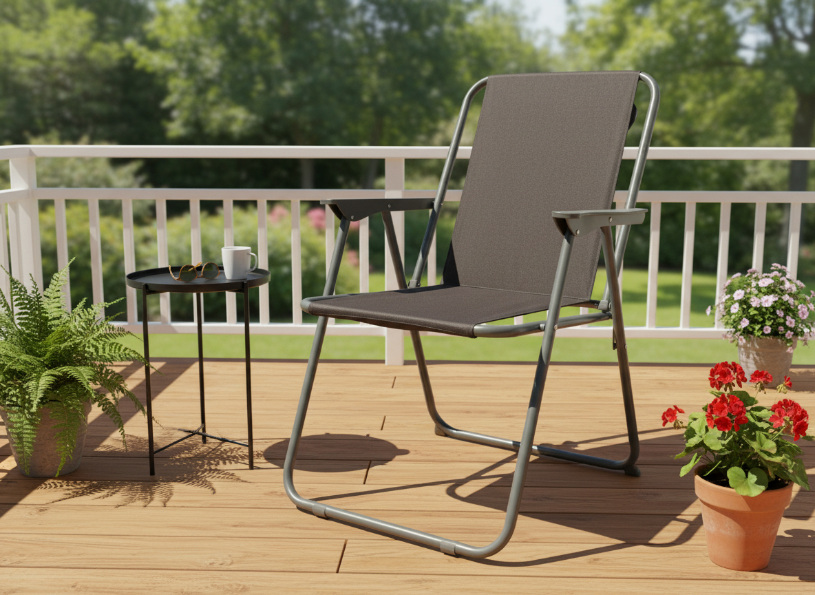 Стильное, легкое и удобное — это серое складной садовый стул станет незаменимым помощником для всех, кто ценит простоту и функциональность. Идеально подходит для балкона, террасы, сада или дачи.