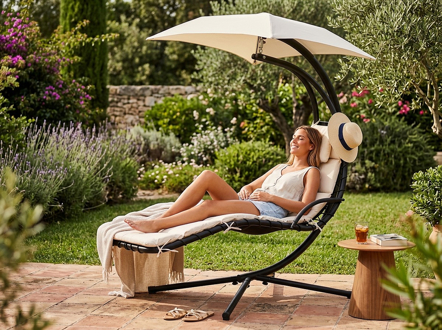 Устойчивая конструкция, удобное сиденье из текстиля и регулируемый навес сделают эту качалку вашим новым любимым садовым предметом мебели — готовым к любому времени суток!
