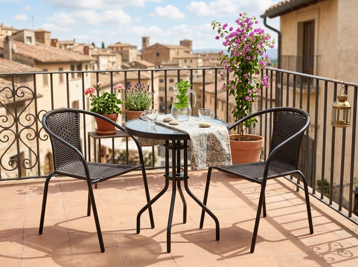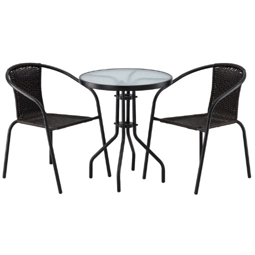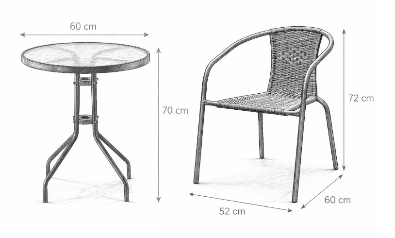 Комплект садовой мебелимарки GARDENLINEидеальноподходитдля тех, кто ищетсочетание классики и элегантности. Простая формаи стильное плетениепоразят каждого. Подходит для любого пространства —балкона, террасы или сада. Столикс закаленным стекломс текстурой прозрачной мозаики (для самостоятельной сборки) наверняка прослужит вам долгие годы. Стулья имеют неразборную сварную конструкцию с порошковой окраской.
