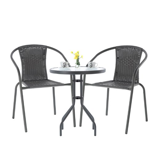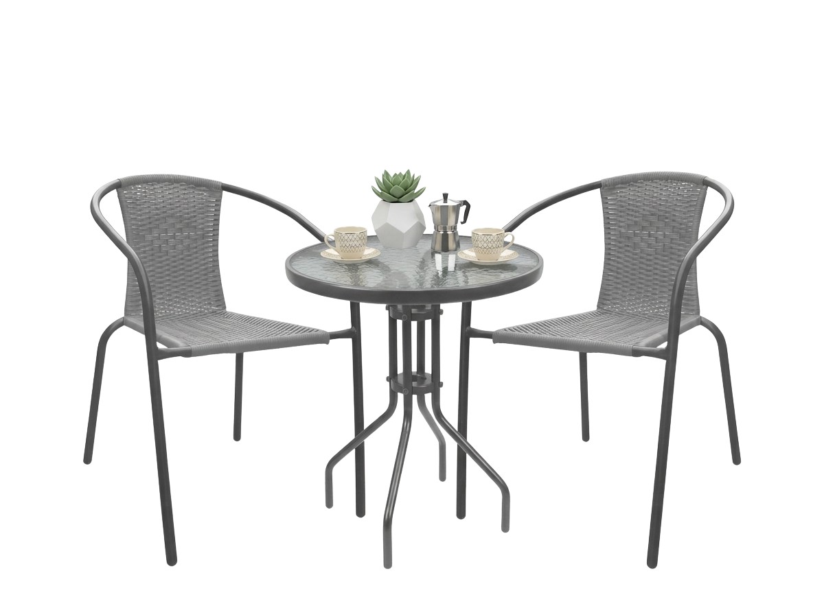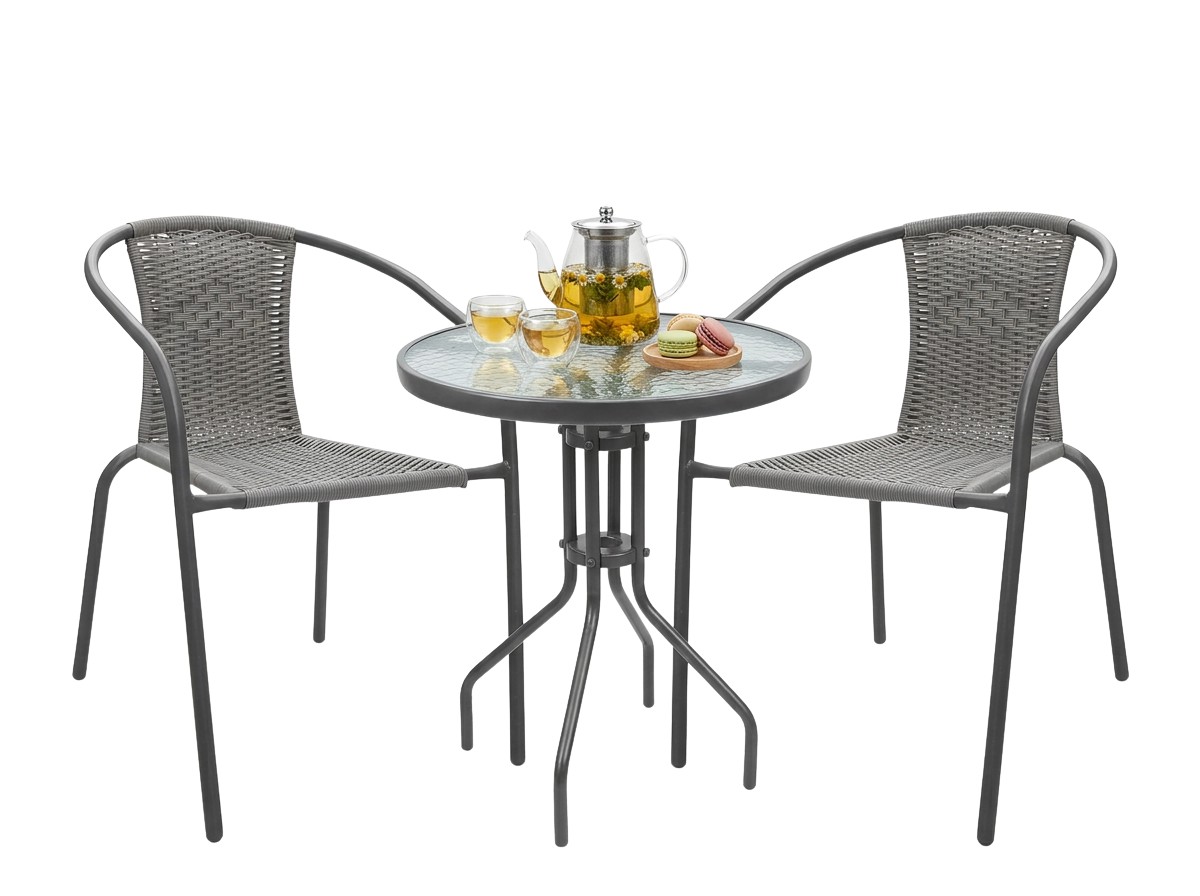 Комплект садовой мебелимарки GARDENLINEидеальноподходитдля тех, кто ищетсочетание классики и элегантности. Простая формаи стильное плетениепоразят каждого. Подходит для любого пространства —балкона, террасы или сада. Столикс закаленным стекломс текстурой прозрачной мозаики (для самостоятельной сборки) наверняка прослужит вам долгие годы. Стулья имеют неразборную сварную конструкцию с порошковой окраской.