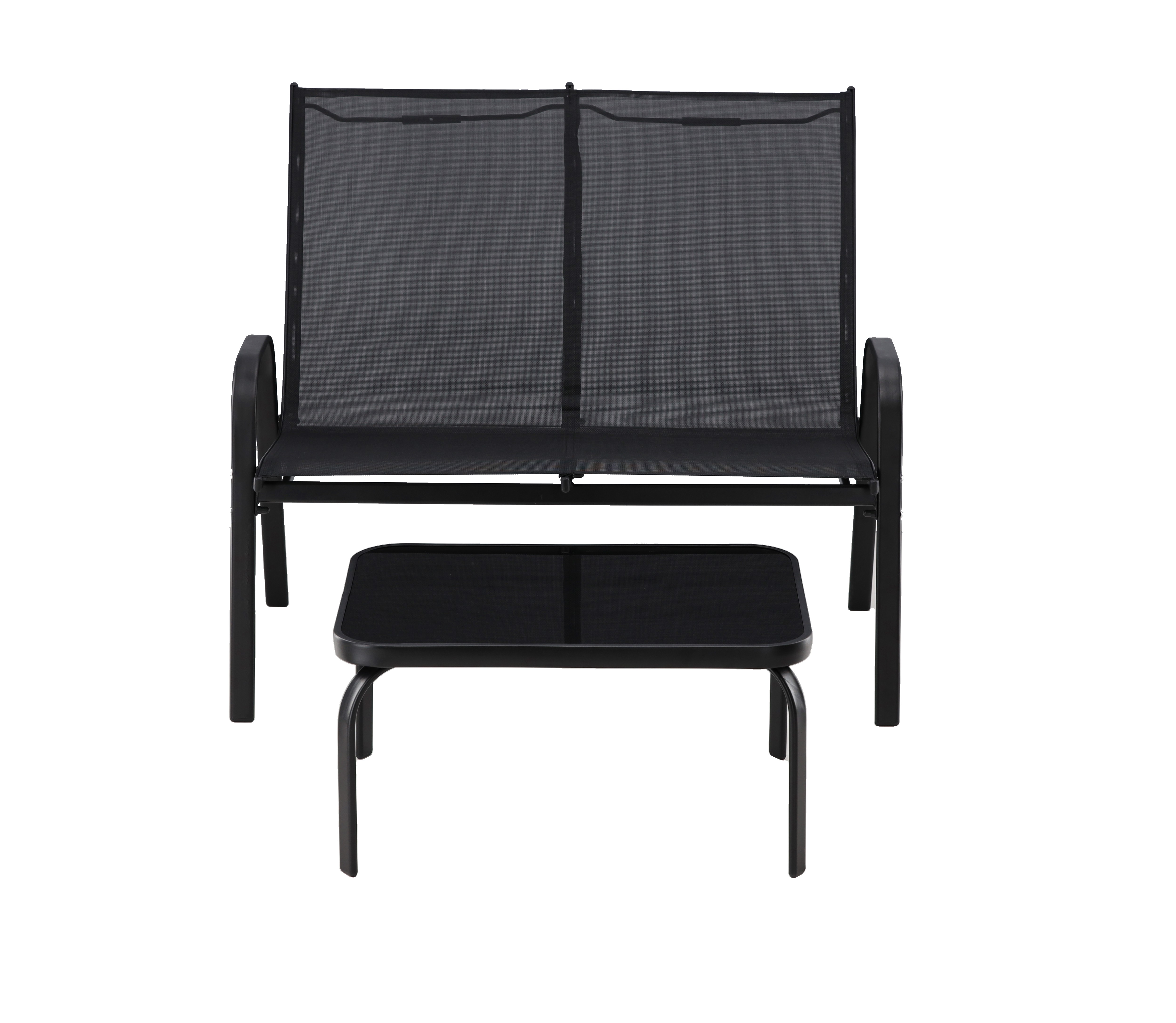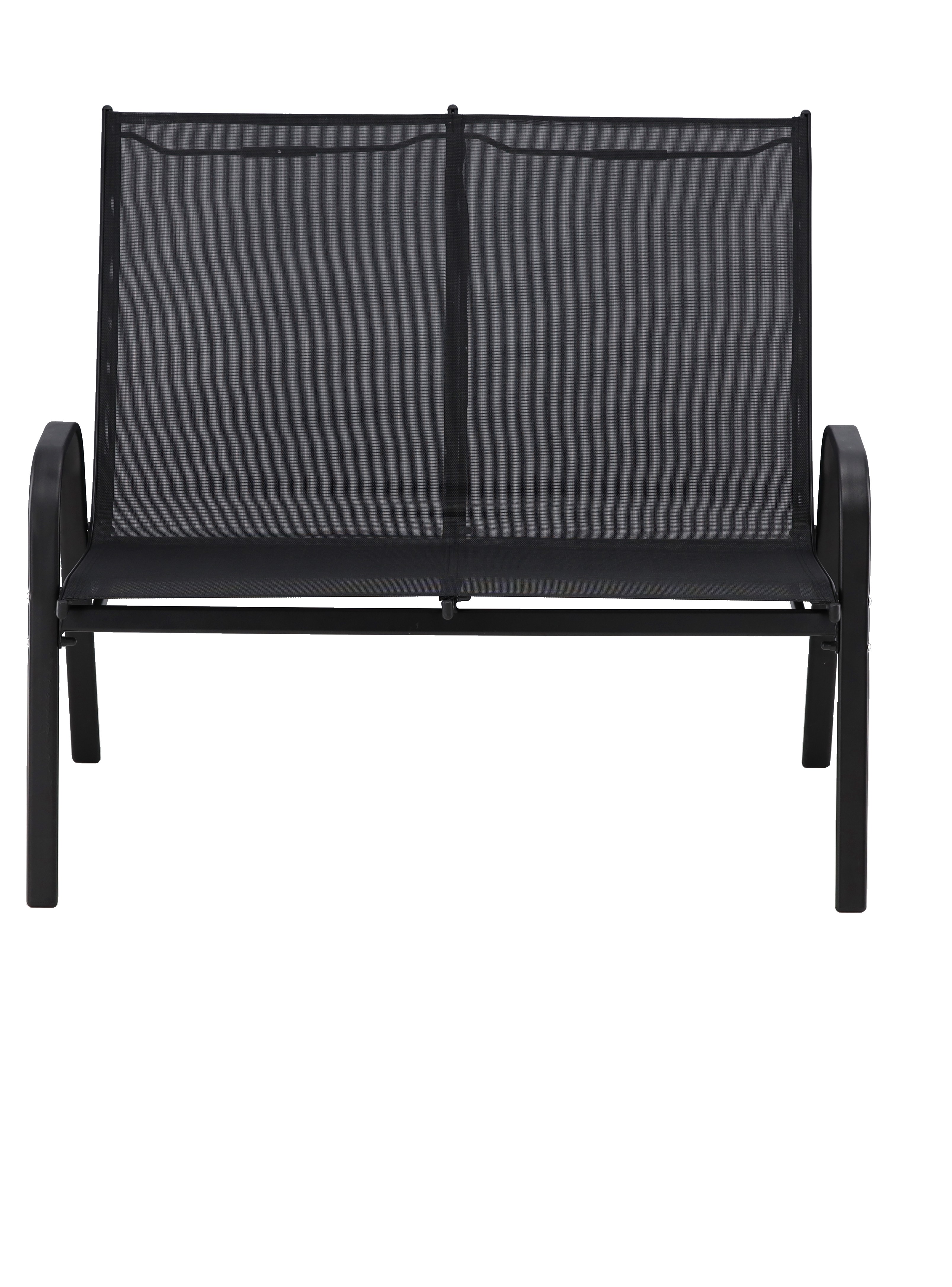 Скамейка размером 66,5x114x78,5 см является идеальным дополнением к комплекту. Как и стулья, она имеет стальную раму с порошковым покрытием и обивку из текстилена, что делает её не только удобной, но и очень устойчивой. Скамейка может вместить до двух человек, представляя собой отличное место для отдыха на свежем воздухе.