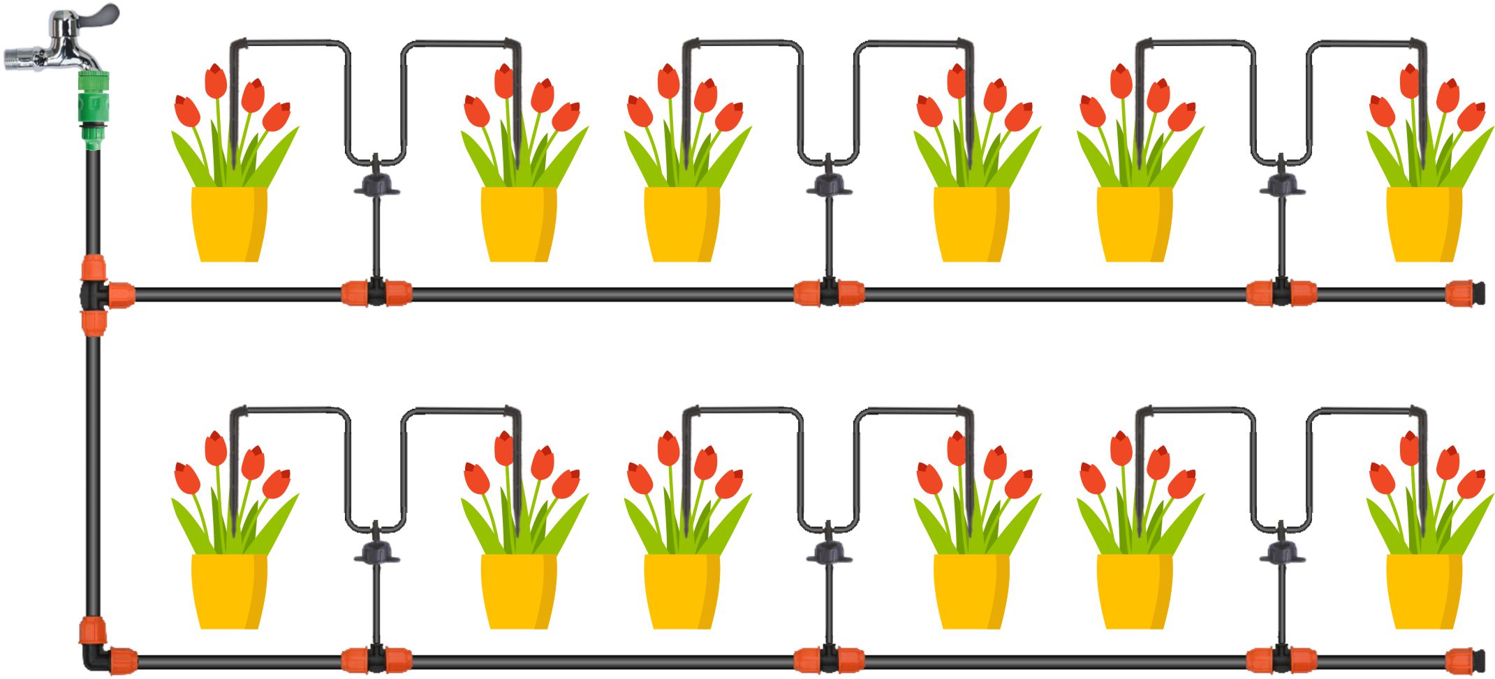 Состав набора:- крановое соединение- черная ПВХ-труба длиной 15 м 9x12 мм- 2 тройника 9x12 мм- 2x колено 9x12 мм- 3 наконечника- 20 зажимов- быстроразъемное соединение- черная ПВХ-труба длиной 10 м 4x7 мм- 10 тройников 9x12 мм с переходником на 4x7 мм- 2 прямых соединителя 9x12 мм- 10 капельниц с трубками- тефлоновая лента- капельница