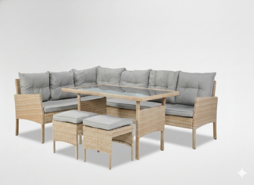 Материалы:• Каркас: сталь с порошковым покрытием• Отделочный материал: двойной ротанг• Подушки: ткань, окрашенная нитью, плотность 200 г/м², наполнитель из губки• Столешница: закаленное стекло 5 мм