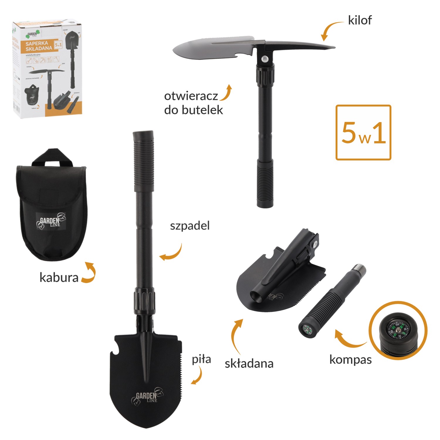 Это практичный и компактный инструмент идеально подходит для кемпинга, походов, а также для повседневных садовых работ. Оснащенный 5 функциями, он обеспечивает универсальность и удобство в любой ситуации.