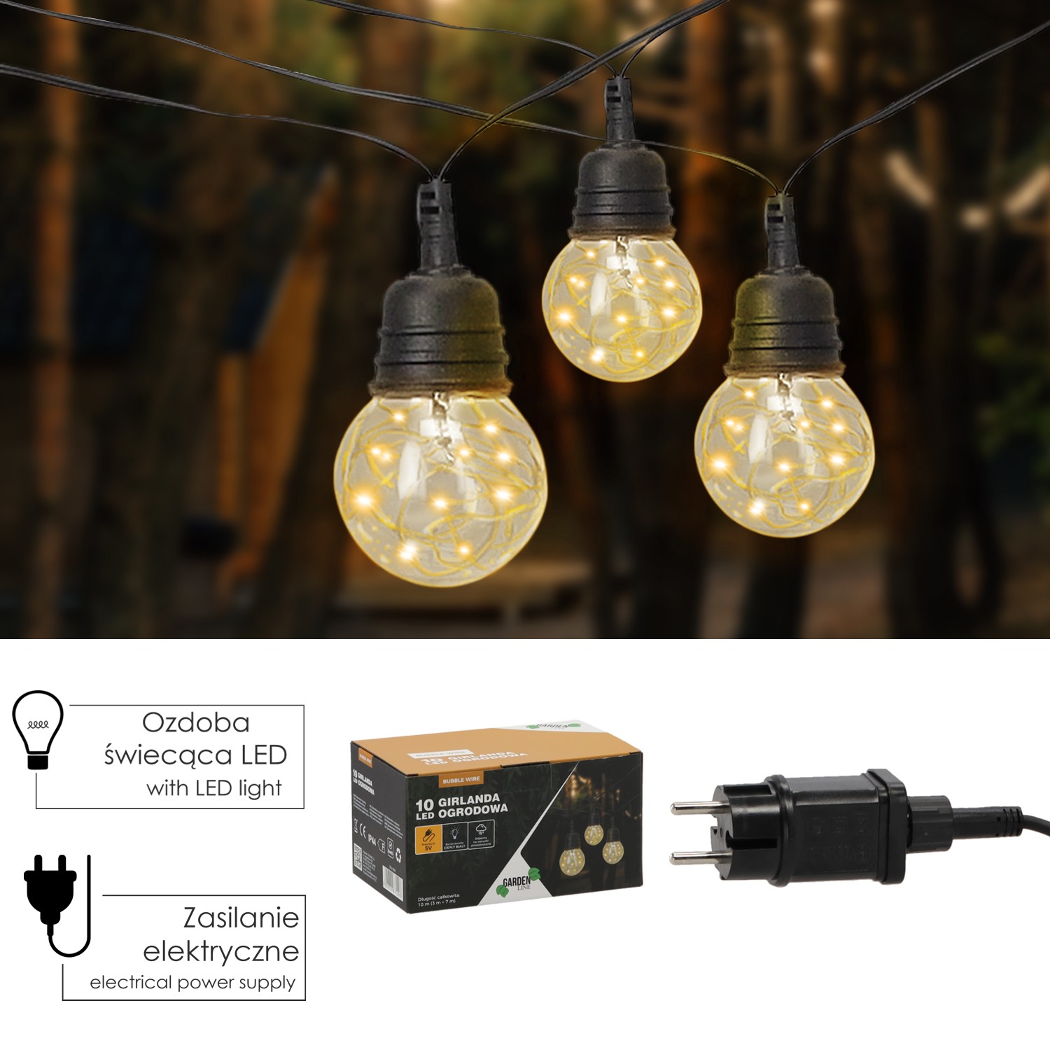 Садовая гирлянда длиной 10 метров, которая идеально подходит для украшения балкона, террасы или сада. Оснащена 10 энергосберегающими светодиодными лампами теплого белого цвета (3000K), обеспечивает приятное и атмосферное освещение в летние вечера. Благодаря крючкам для подвешивания монтаж осуществляется быстро и просто.